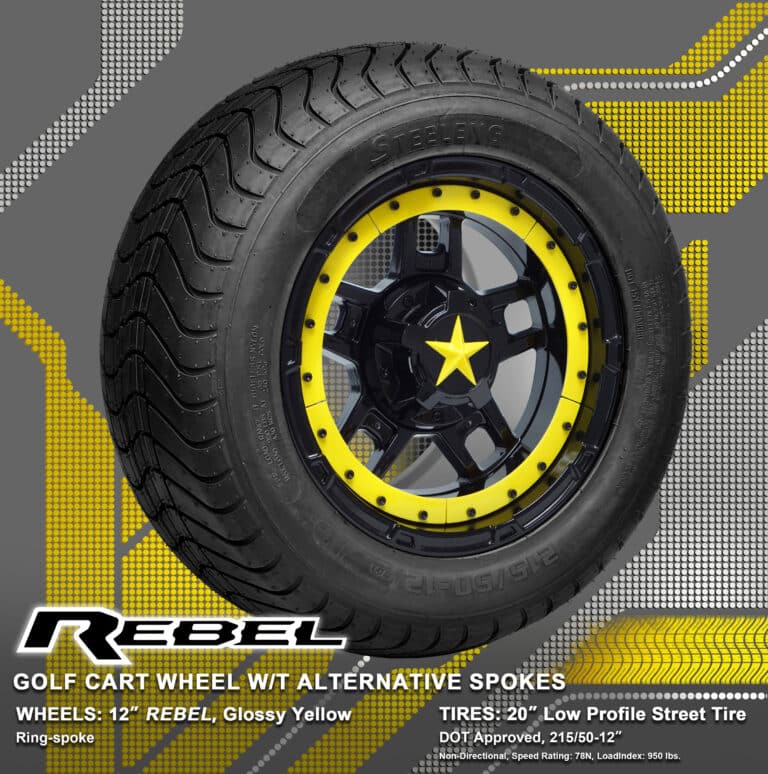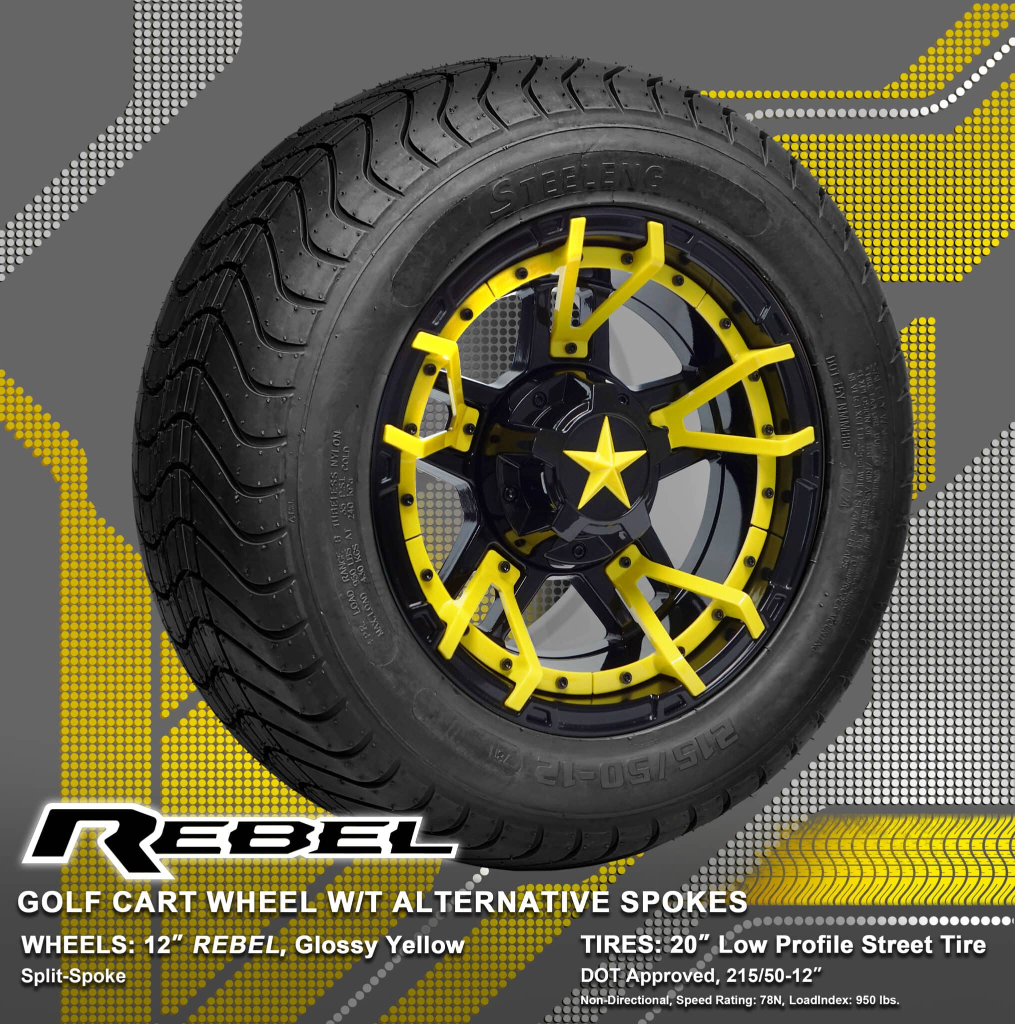 BNDL-TR1213-WH1251-WIRB37-LN0002 – SGC 12″ REBEL Glossy Black Wheel – Aluminum Alloy / STEELENG 215/50-12 Comfort Ride Street Tire DOT Approved / REBEL Inserts-Split Spoke-Glossy Yellow