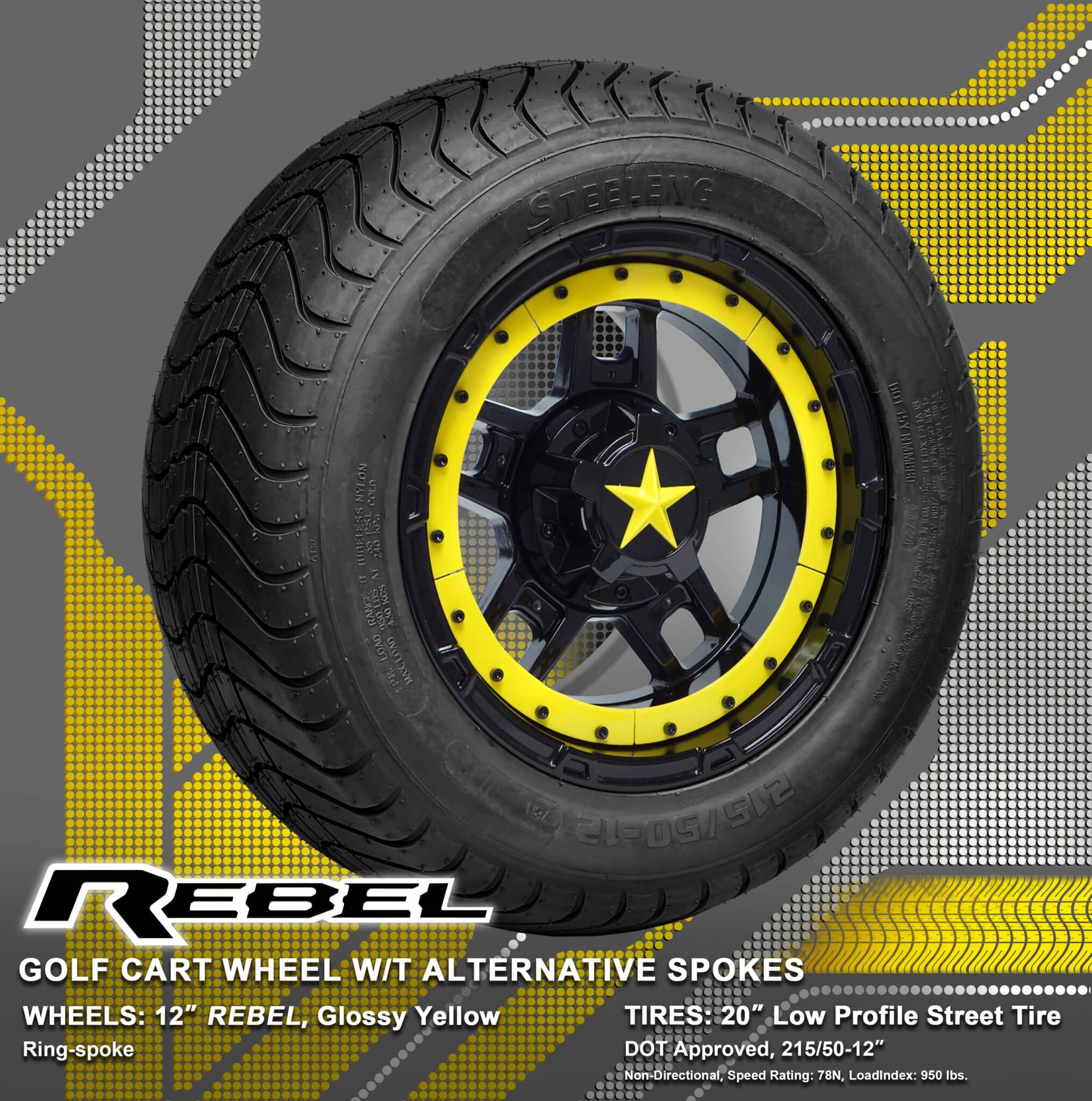 BNDL-TR1213-WH1251-WIRB24-LN0002 – SGC 12″ REBEL Glossy Black Wheel – Aluminum Alloy / STEELENG 215/50-12 Comfort Ride Street Tire DOT Approved / REBEL Inserts-Ring-Glossy Yellow