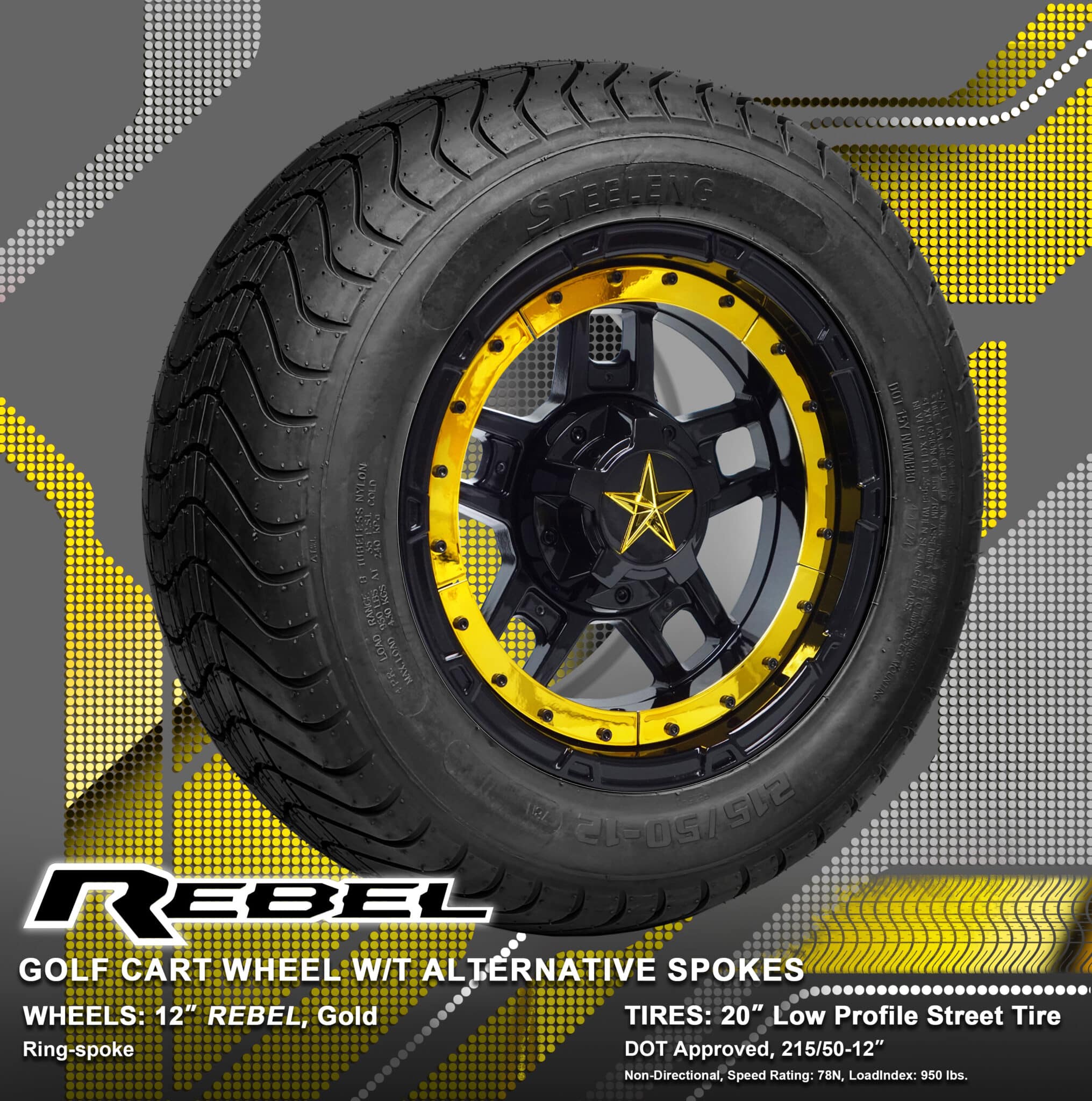 BNDL-TR1213-WH1251-WIRB25-LN0002 – SGC 12″ REBEL Glossy Black Wheel – Aluminum Alloy / STEELENG 215/50-12 Comfort Ride Street Tire DOT Approved / REBEL Inserts-Ring-Gold