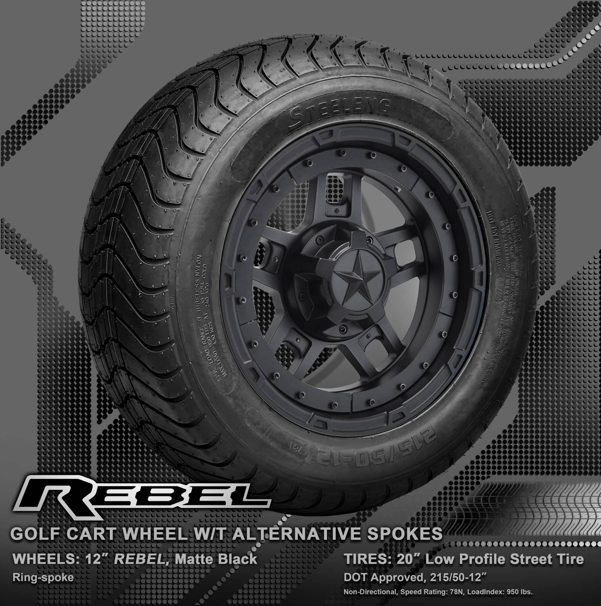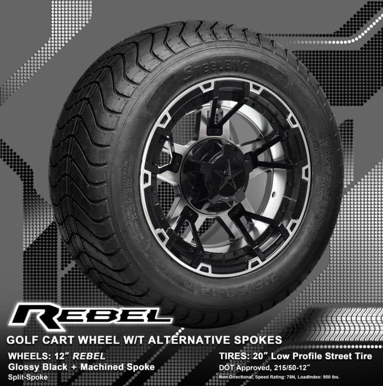 BNDL-TR1213-WH1251-WIRB29-LN0002 – SGC 12″ REBEL Glossy Black Wheel – Aluminum Alloy / STEELENG 215/50-12 Comfort Ride Street Tire DOT Approved / REBEL Inserts-Split Spoke-Glossy Black
