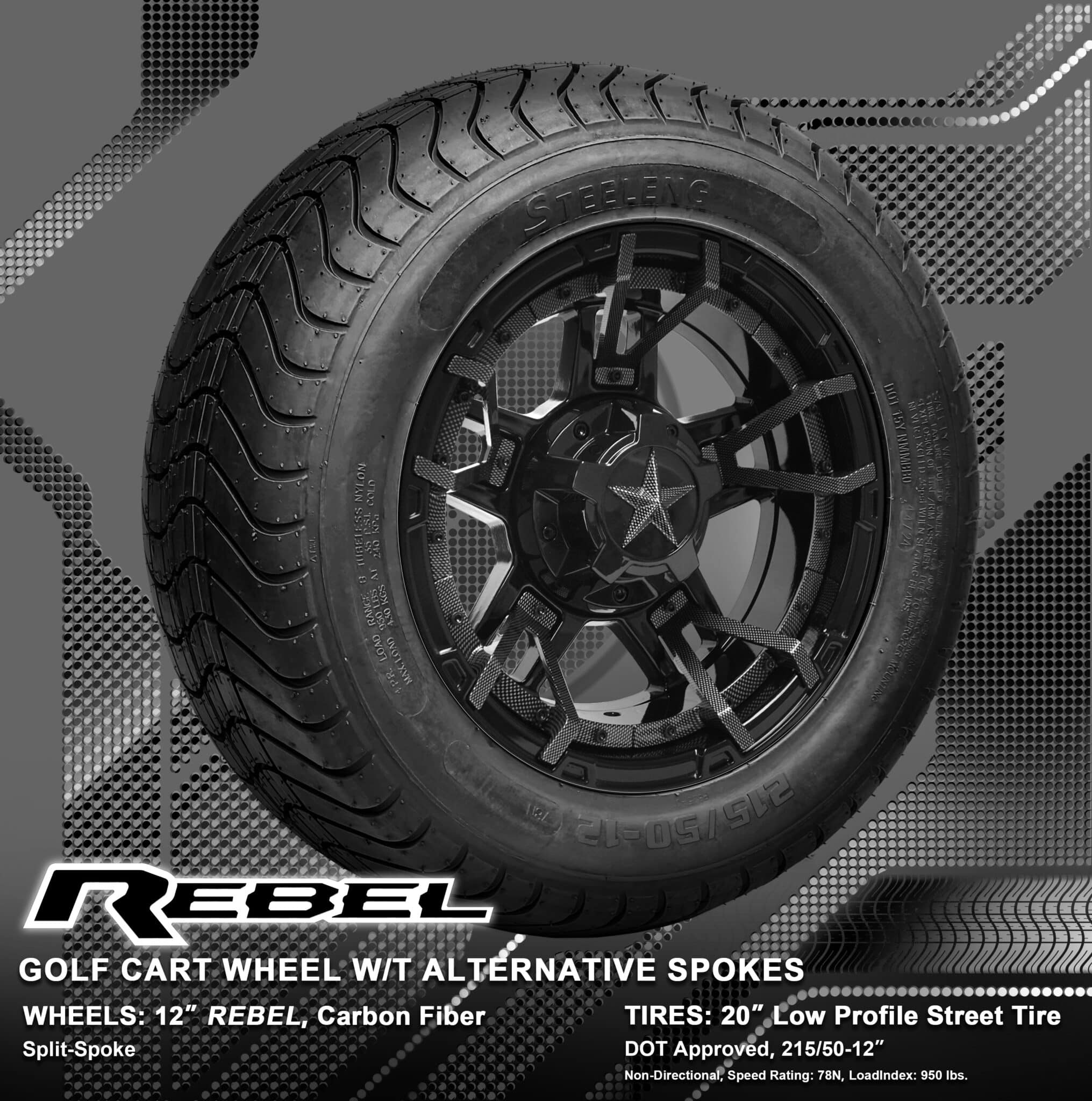 BNDL-TR1213-WH1251-WIRB27-LN0002 – SGC 12″ REBEL Glossy Black Wheel – Aluminum Alloy / STEELENG 215/50-12 Comfort Ride Street Tire DOT Approved / REBEL Inserts-Split Spoke-Carbon Fiber