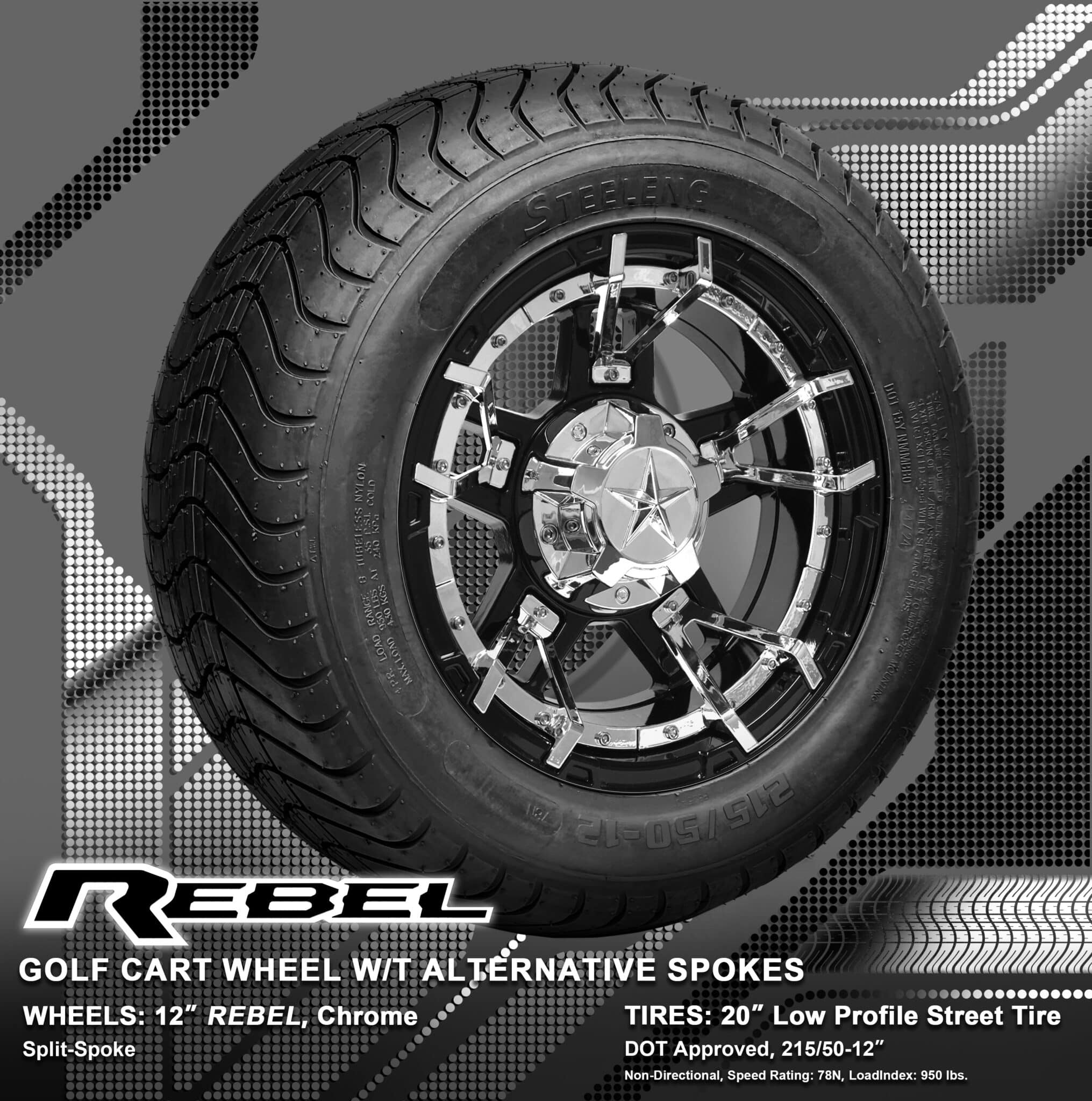 BNDL-TR1213-WH1251-WIRB28-LN0002 – SGC 12″ REBEL Glossy Black Wheel – Aluminum Alloy / STEELENG 215/50-12 Comfort Ride Street Tire DOT Approved / REBEL Inserts-Split Spoke-Chrome