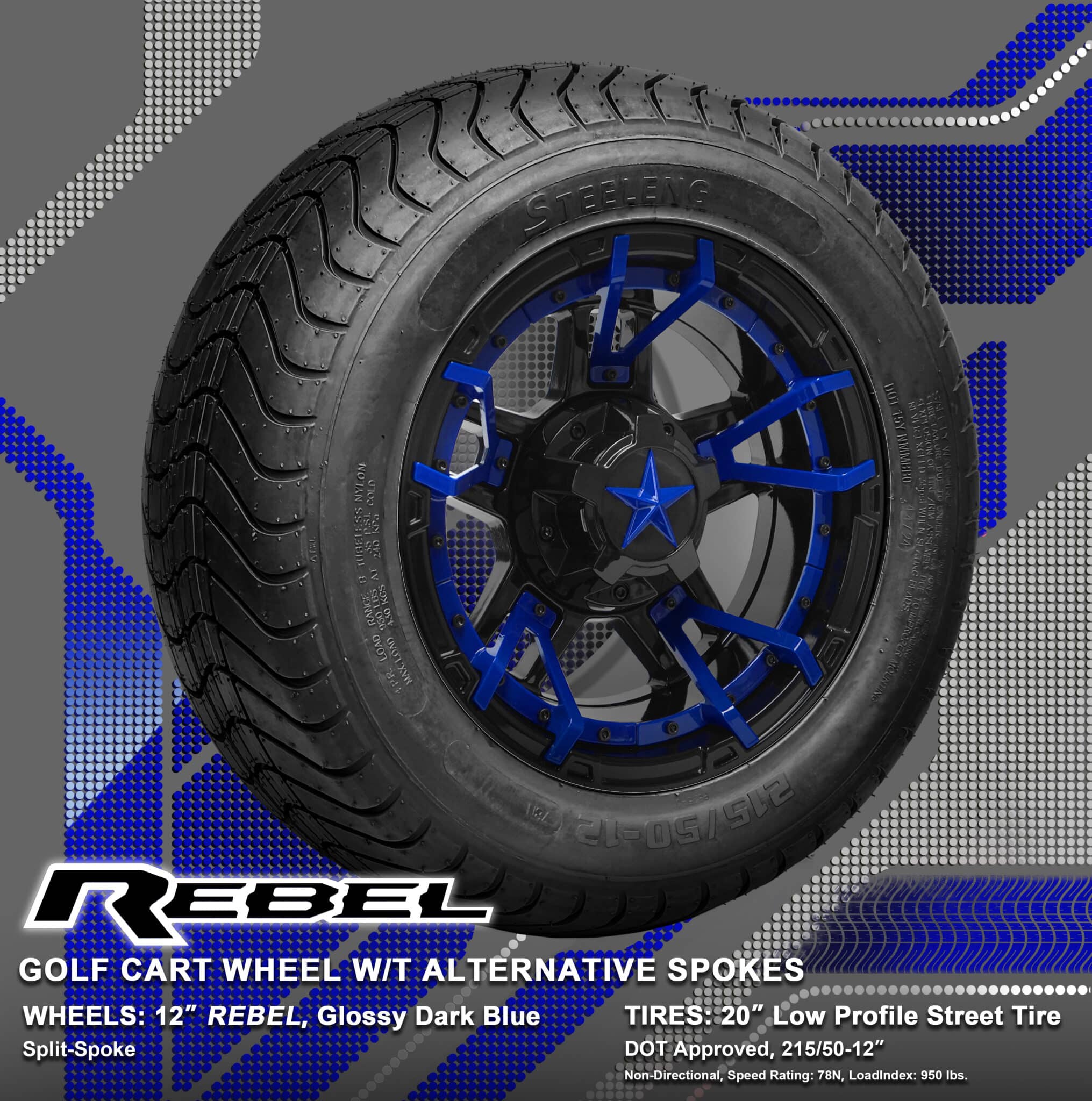 BNDL-TR1213-WH1251-WIRB30-LN0002 – SGC 12″ REBEL Glossy Black Wheel – Aluminum Alloy / STEELENG 215/50-12 Comfort Ride Street Tire DOT Approved / REBEL Inserts-Split Spoke-Glossy Dark Blue