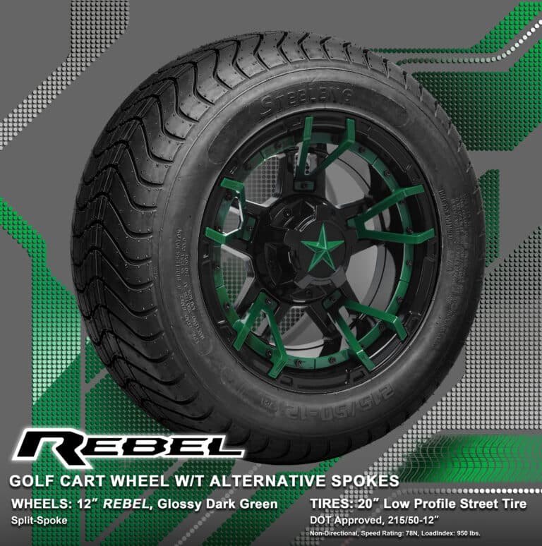 BNDL-TR1213-WH1251-WIRB31-LN0002 – SGC 12″ REBEL Glossy Black Wheel – Aluminum Alloy / STEELENG 215/50-12 Comfort Ride Street Tire DOT Approved / REBEL Inserts-Split Spoke-Glossy Dark Green