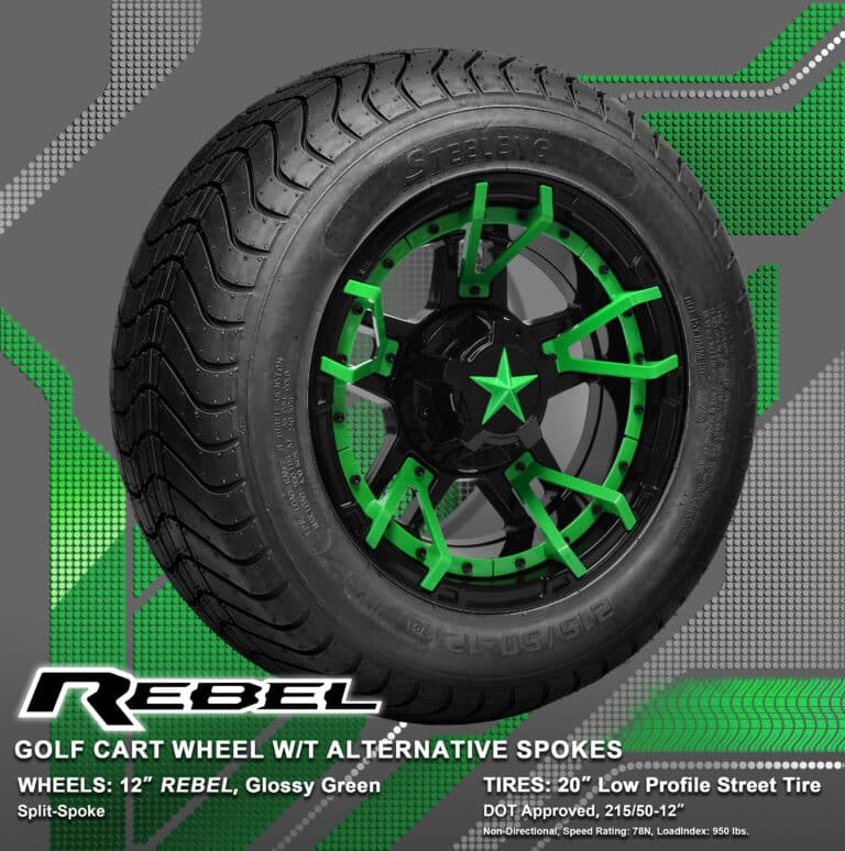 BNDL-TR1213-WH1251-WIRB32-LN0002 – SGC 12″ REBEL Glossy Black Wheel – Aluminum Alloy / STEELENG 215/50-12 Comfort Ride Street Tire DOT Approved / REBEL Inserts-Split Spoke-Glossy Green