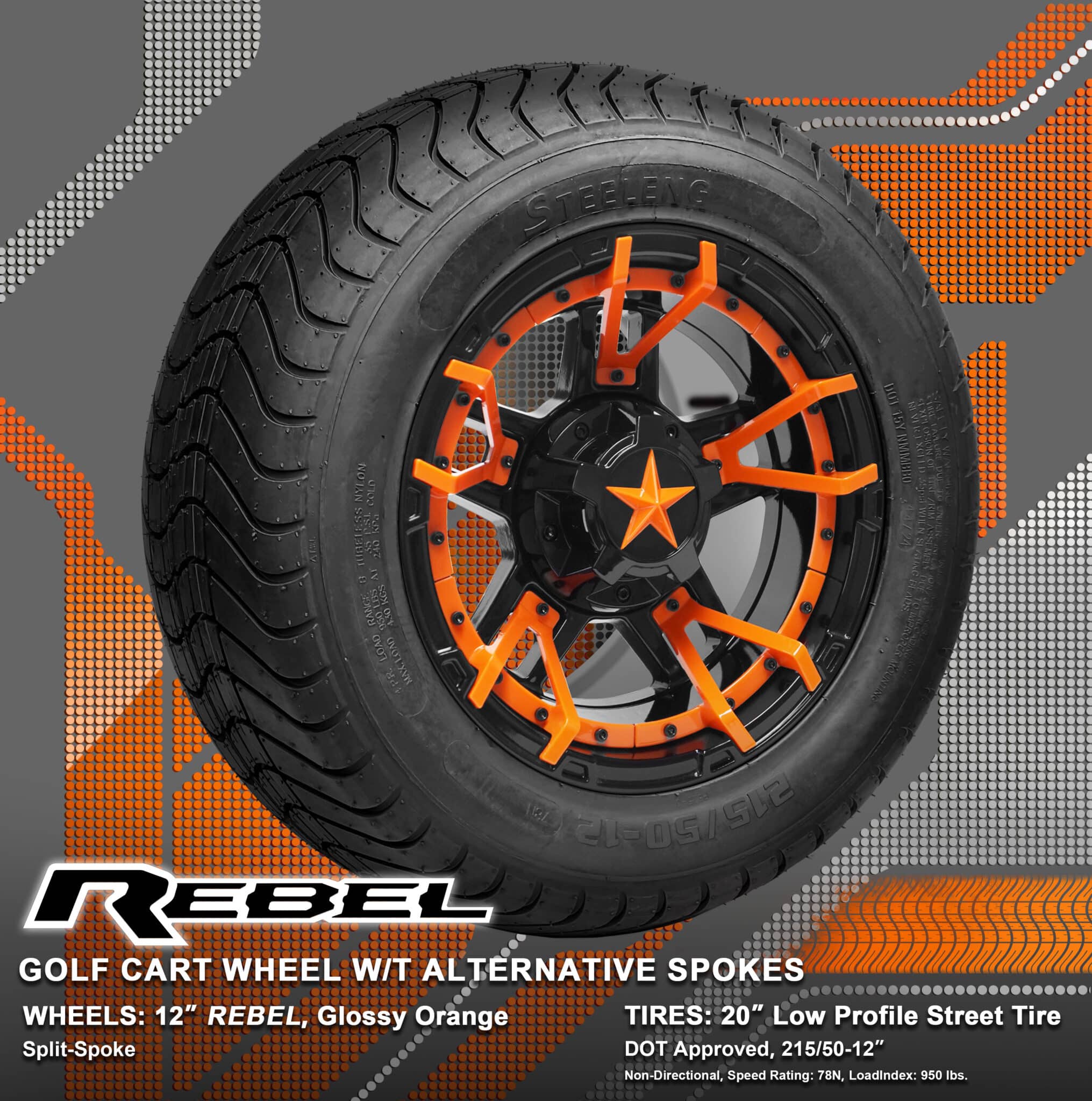 BNDL-TR1213-WH1251-WIRB33-LN0002 – SGC 12″ REBEL Glossy Black Wheel – Aluminum Alloy / STEELENG 215/50-12 Comfort Ride Street Tire DOT Approved / REBEL Inserts-Split Spoke-Glossy Orange