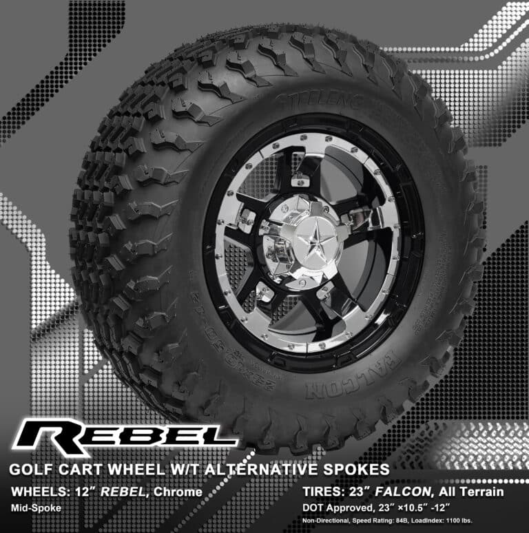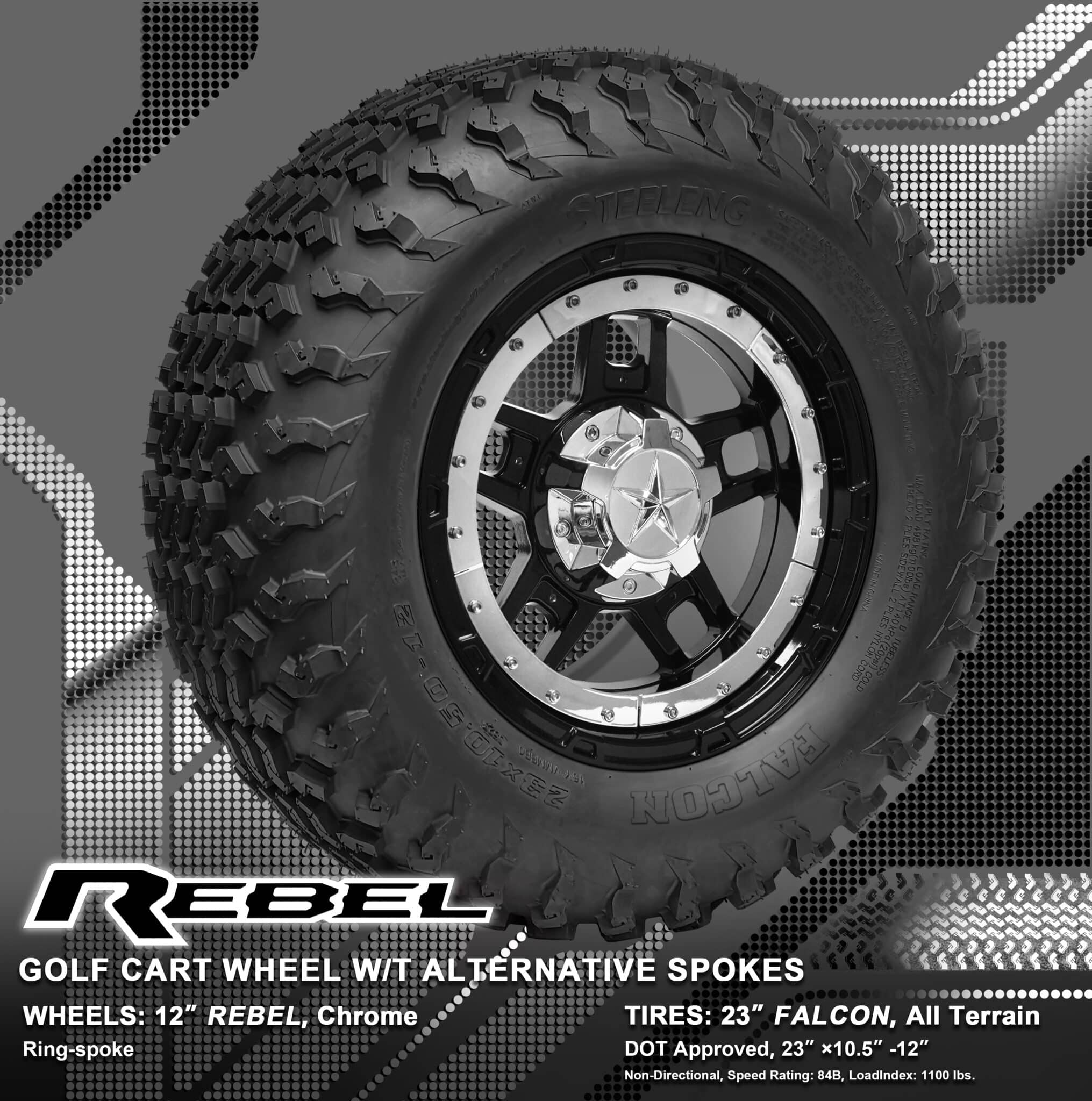 BNDL-TR1214-WH1251-WIRB02-LN0002 – SGC 12″ REBEL Glossy Black Wheel – Aluminum Alloy / STEELENG 23″x10.5″-12″ FALCON All Terrain Tire / REBEL Inserts-Mid Spoke-Chrome