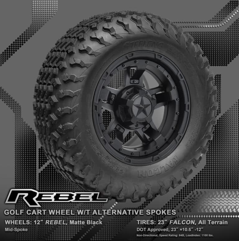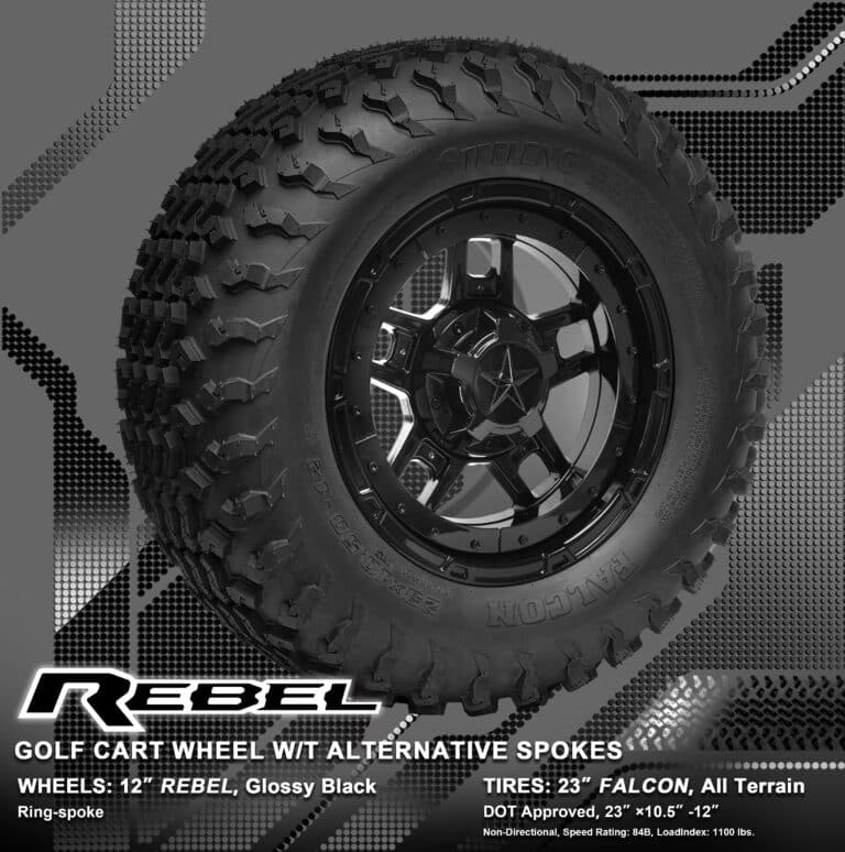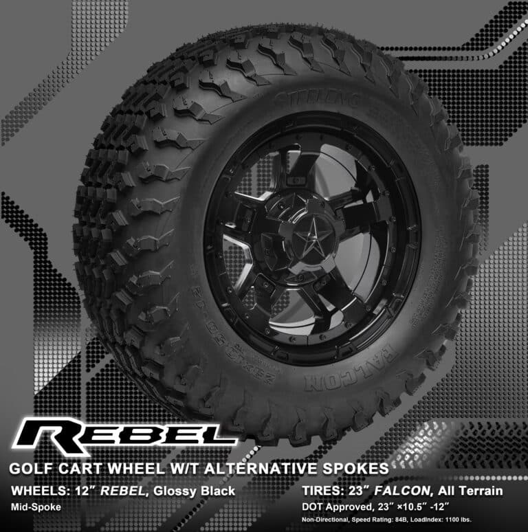 BNDL-TR1214-WH1251-WIRB03-LN0002 – SGC 12″ REBEL Glossy Black Wheel – Aluminum Alloy / STEELENG 23″x10.5″-12″ FALCON All Terrain Tire / REBEL Inserts-Mid Spoke-Glossy Black