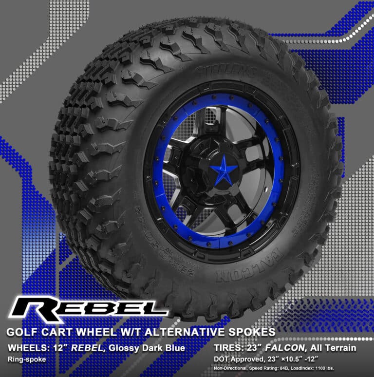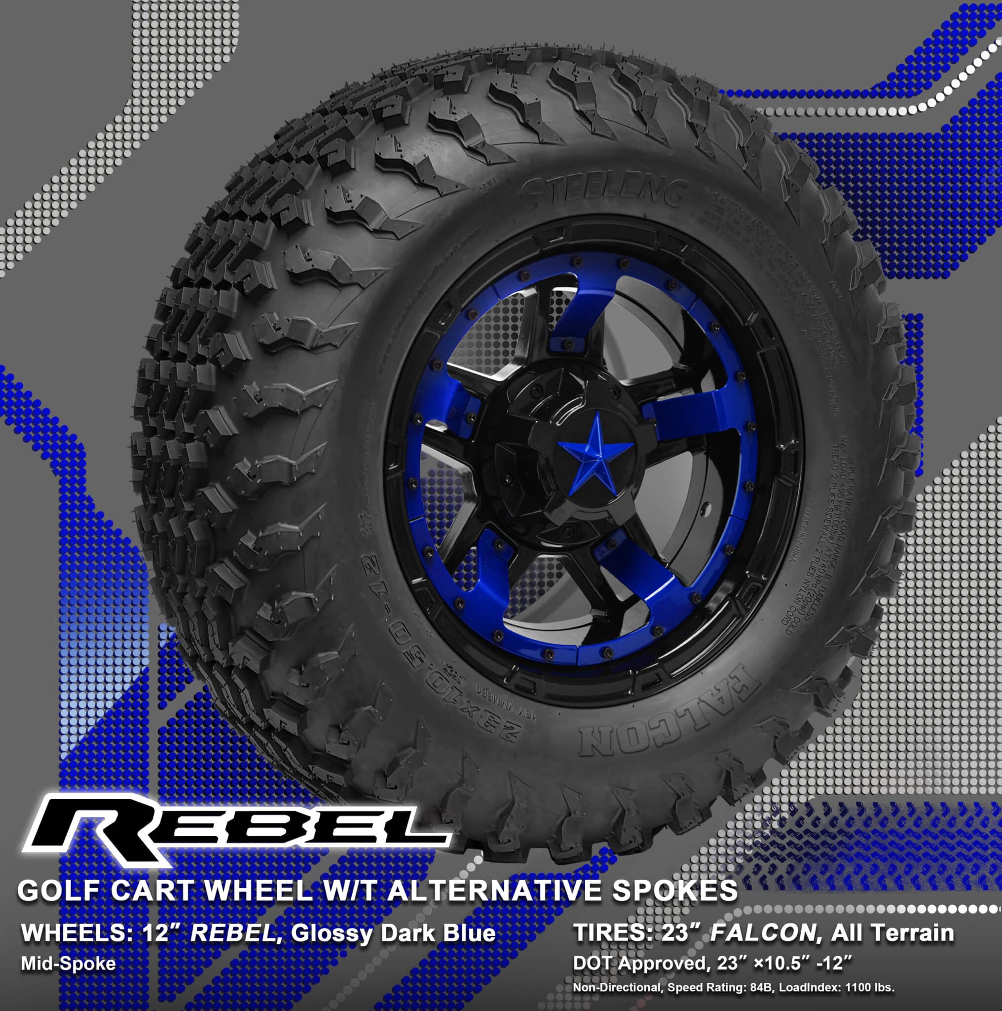 BNDL-TR1214-WH1251-WIRB04-LN0002 – SGC 12″ REBEL Glossy Black Wheel – Aluminum Alloy / STEELENG 23″x10.5″-12″ FALCON All Terrain Tire / REBEL Inserts-Mid Spoke-Glossy Dark Blue