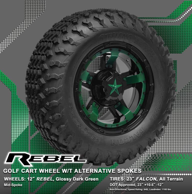 BNDL-TR1214-WH1251-WIRB05-LN0002 – SGC 12″ REBEL Glossy Black Wheel – Aluminum Alloy / STEELENG 23″x10.5″-12″ FALCON All Terrain Tire / REBEL Inserts-Mid Spoke-Glossy Dark Green