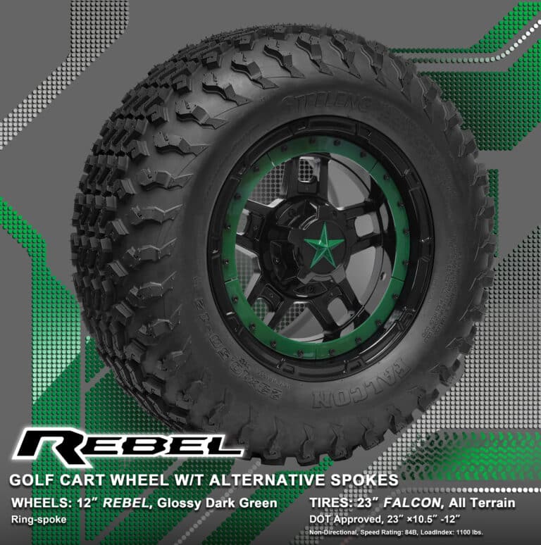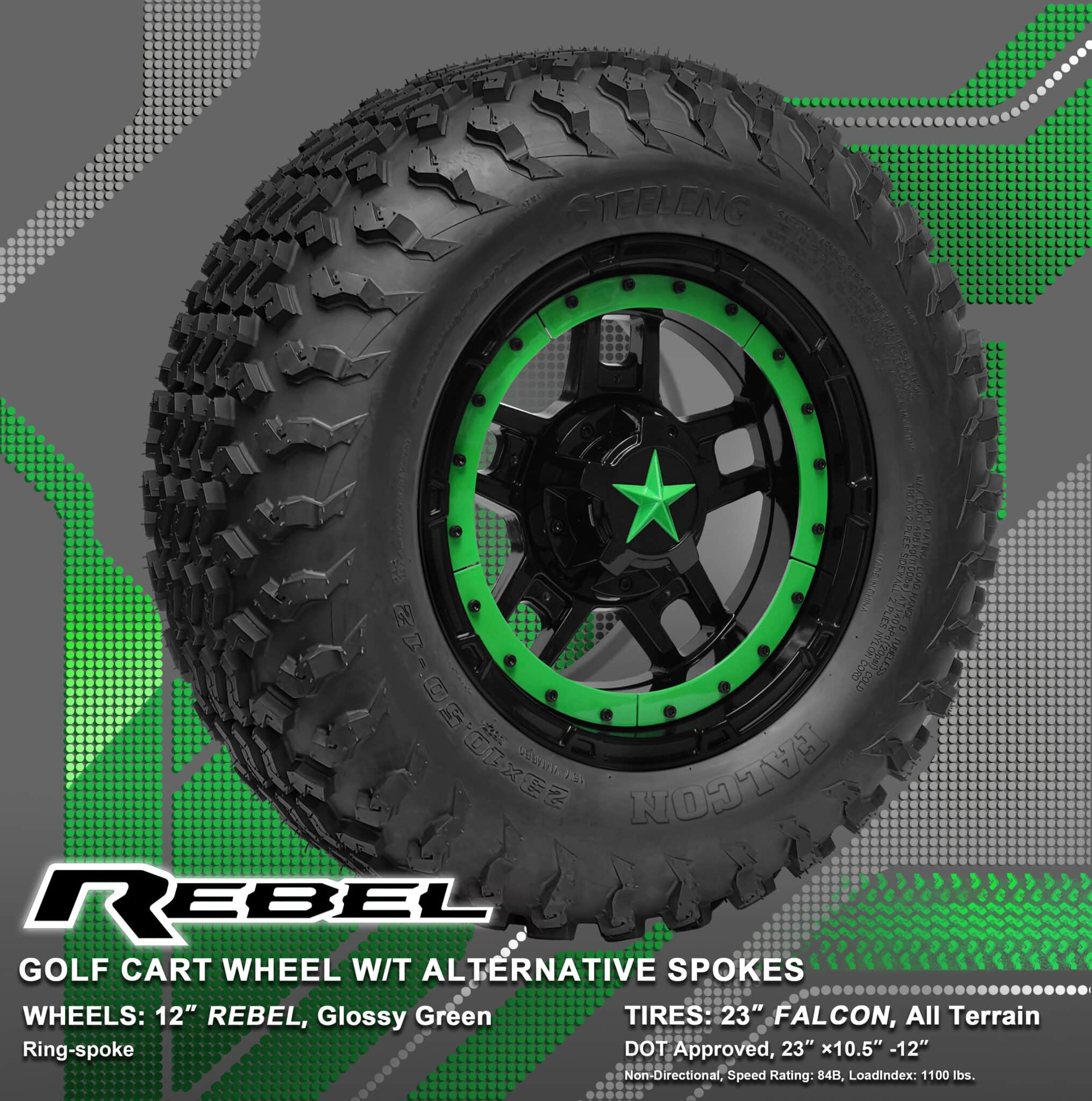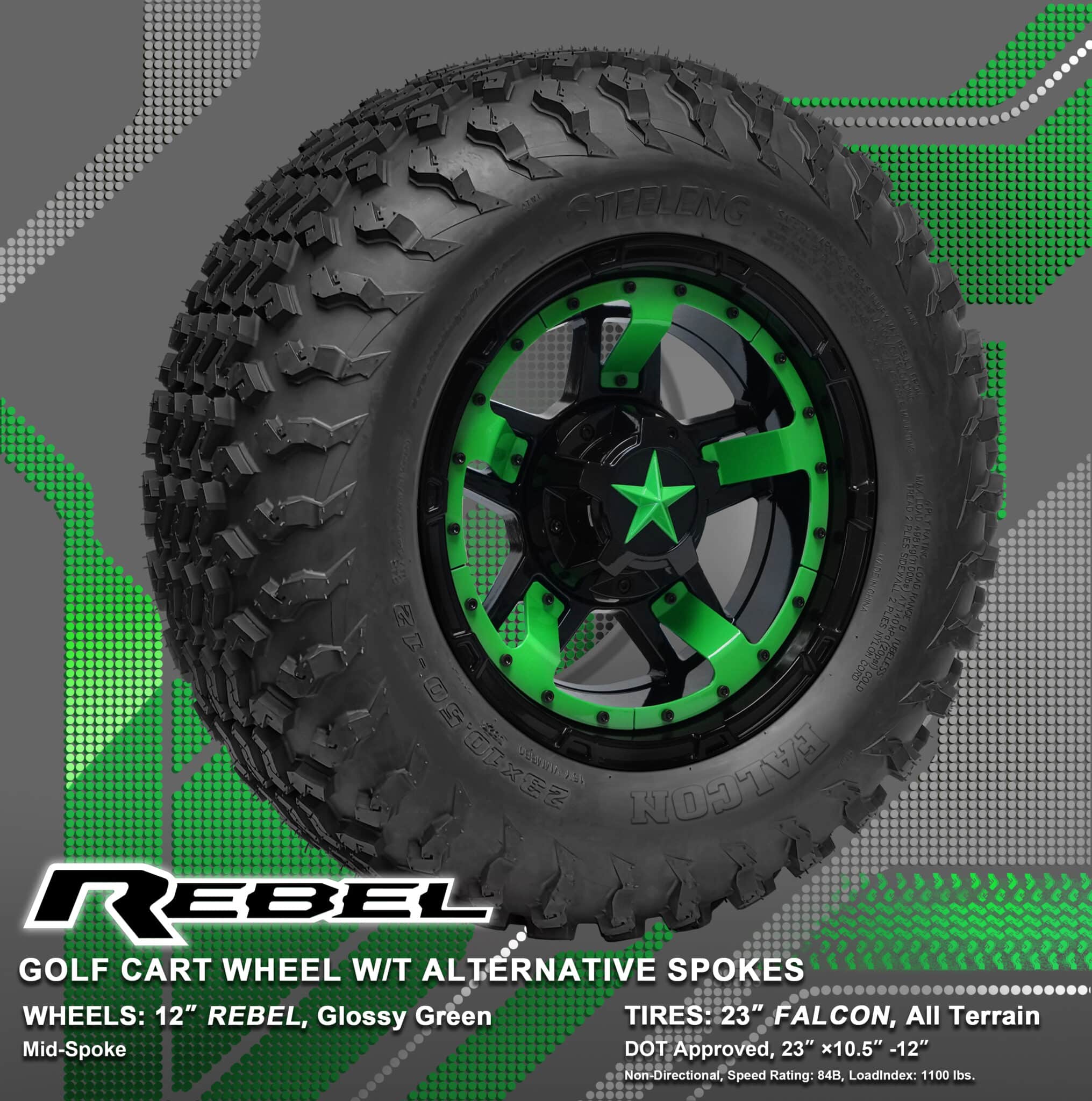 BNDL-TR1214-WH1251-WIRB06-LN0002 – SGC 12″ REBEL Glossy Black Wheel – Aluminum Alloy / STEELENG 23″x10.5″-12″ FALCON All Terrain Tire / REBEL Inserts-Mid Spoke-Glossy Green