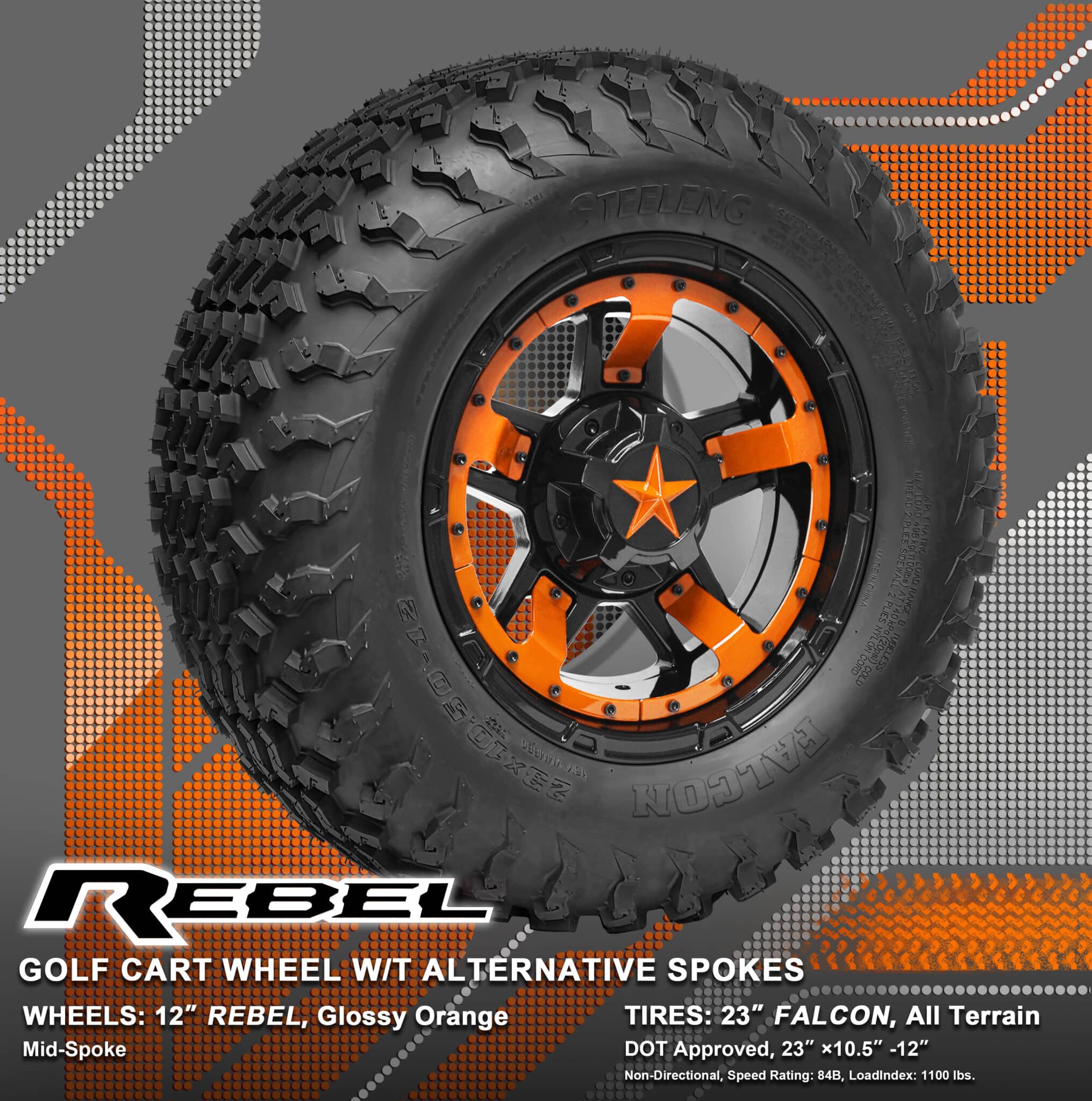 BNDL-TR1214-WH1251-WIRB07-LN0002 – SGC 12″ REBEL Glossy Black Wheel – Aluminum Alloy / STEELENG 23″x10.5″-12″ FALCON All Terrain Tire / REBEL Inserts-Mid Spoke-Glossy Orange