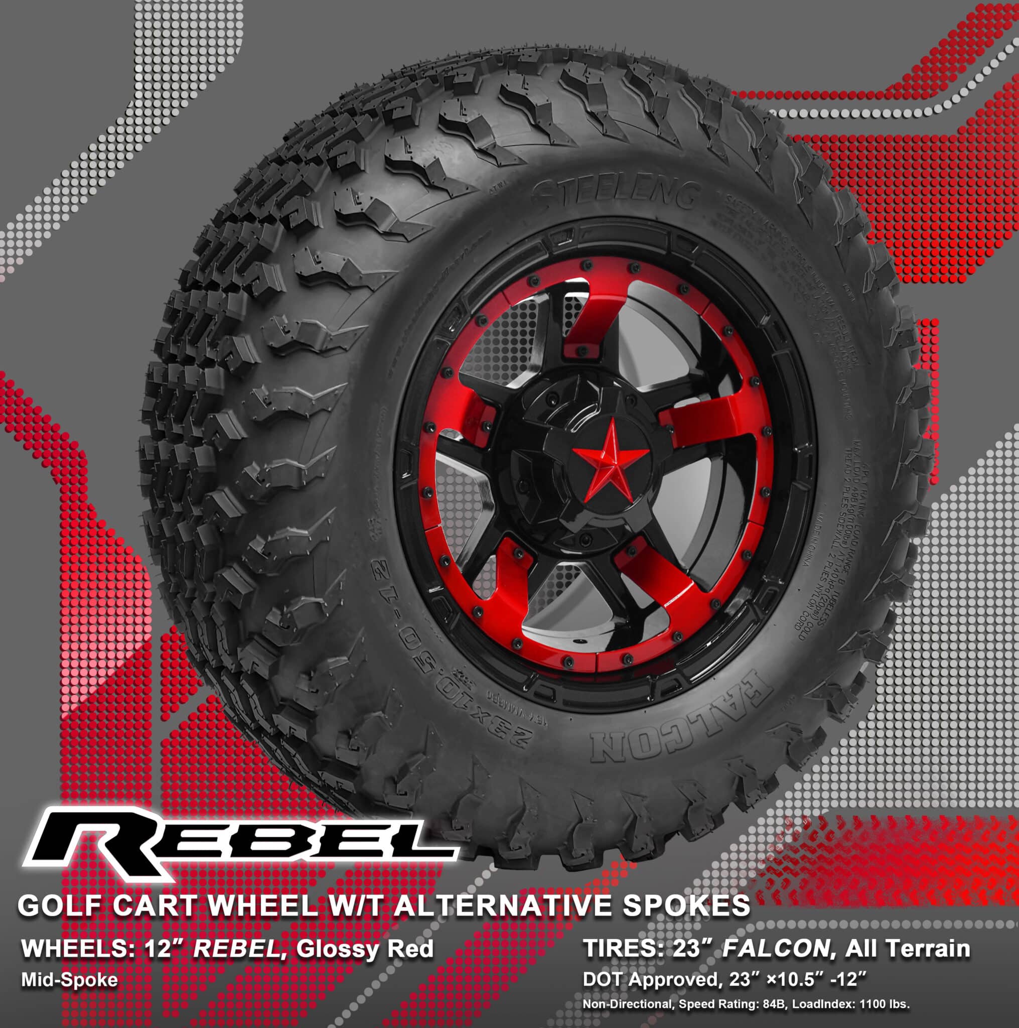 BNDL-TR1214-WH1251-WIRB08-LN0002 – SGC 12″ REBEL Glossy Black Wheel – Aluminum Alloy / STEELENG 23″x10.5″-12″ FALCON All Terrain Tire / REBEL Inserts-Mid Spoke-Glossy Red
