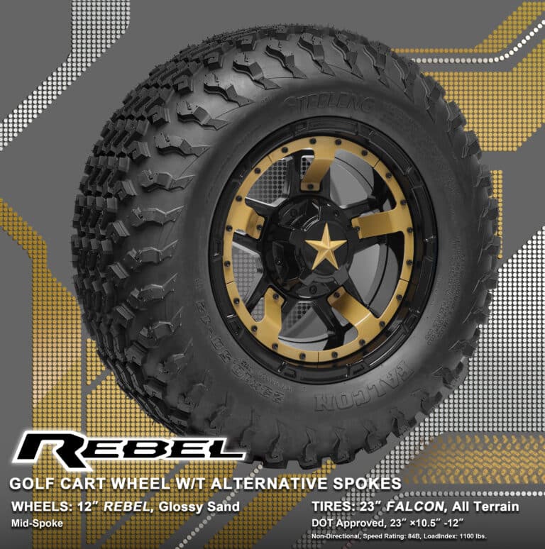 BNDL-TR1214-WH1251-WIRB09-LN0002 – SGC 12″ REBEL Glossy Black Wheel – Aluminum Alloy / STEELENG 23″x10.5″-12″ FALCON All Terrain Tire / REBEL Inserts-Mid Spoke-Glossy Sand