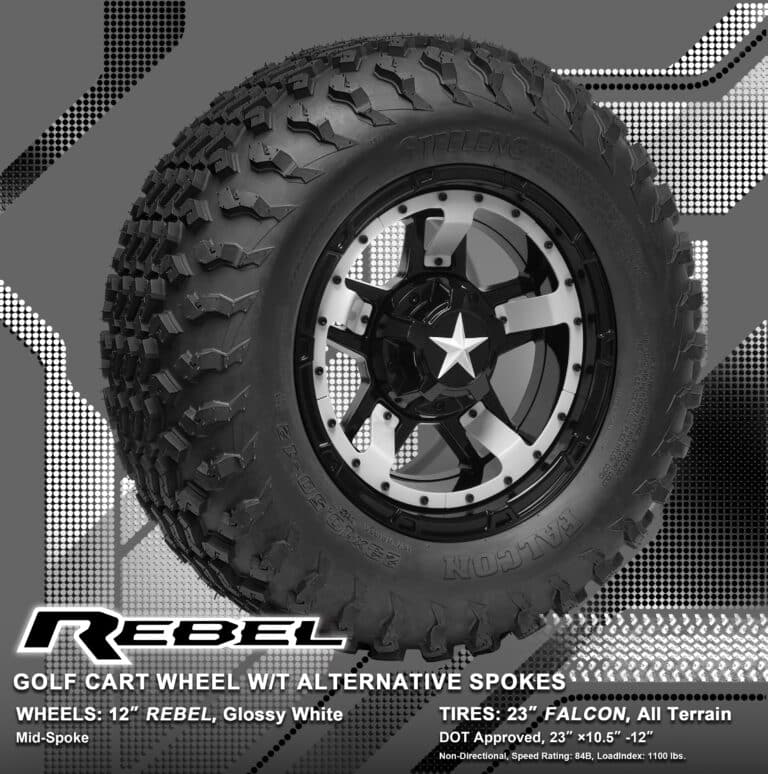 BNDL-TR1214-WH1251-WIRB10-LN0002 – SGC 12″ REBEL Glossy Black Wheel – Aluminum Alloy / STEELENG 23″x10.5″-12″ FALCON All Terrain Tire / REBEL Inserts-Mid Spoke-Glossy White
