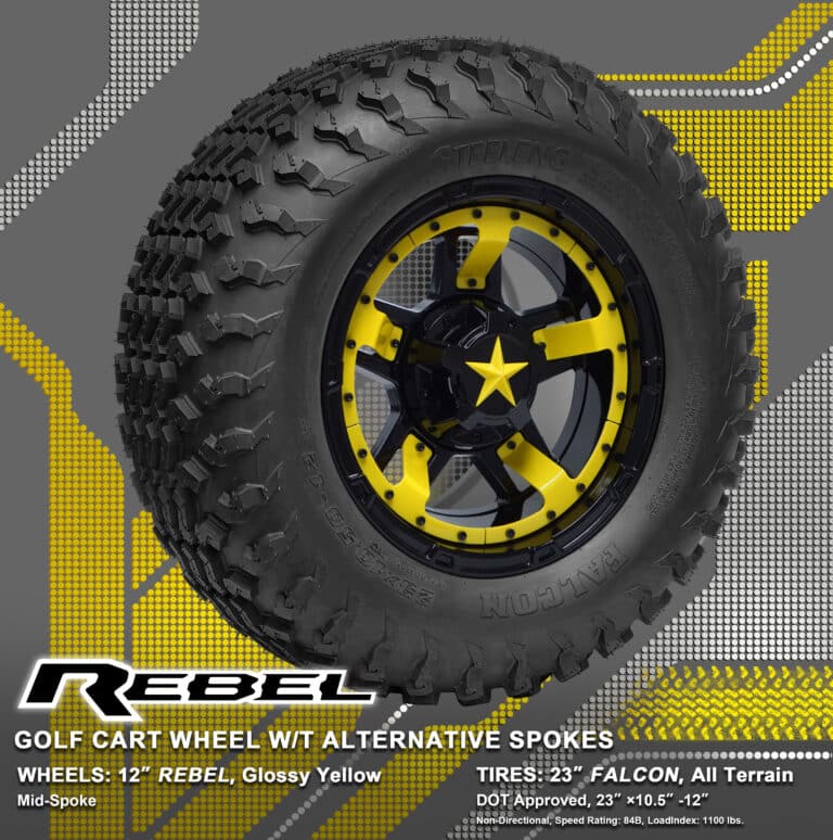 BNDL-TR1214-WH1251-WIRB11-LN0002 – SGC 12″ REBEL Glossy Black Wheel – Aluminum Alloy / STEELENG 23″x10.5″-12″ FALCON All Terrain Tire / REBEL Inserts-Mid Spoke-Glossy Yellow
