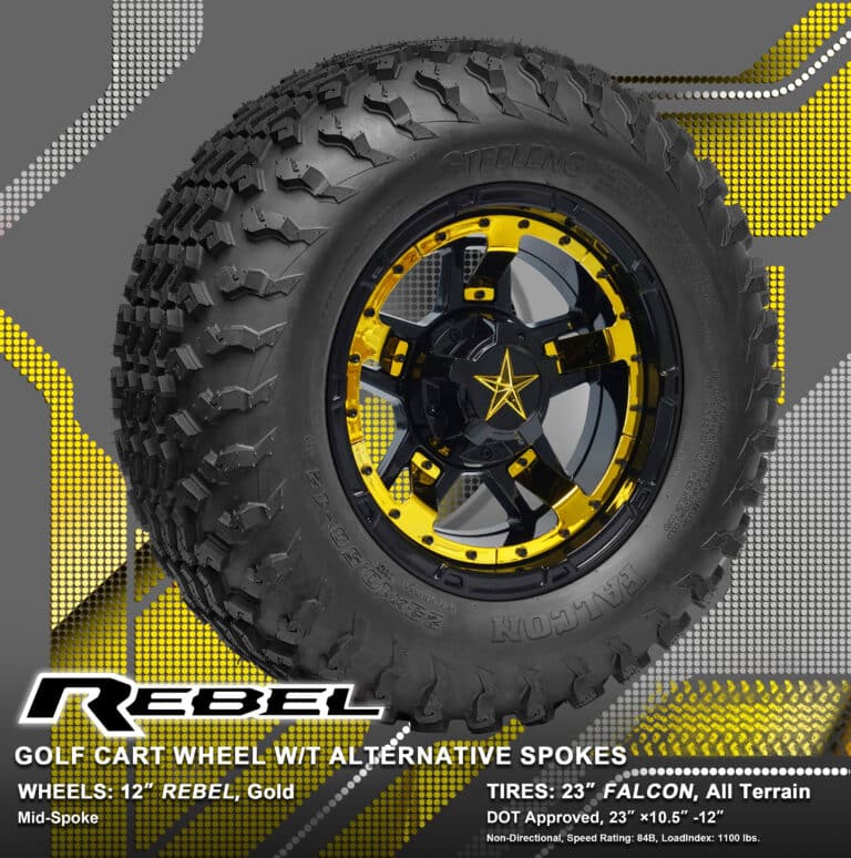 BNDL-TR1214-WH1251-WIRB12-LN0002 – SGC 12″ REBEL Glossy Black Wheel – Aluminum Alloy / STEELENG 23″x10.5″-12″ FALCON All Terrain Tire / REBEL Inserts-Mid Spoke-Gold