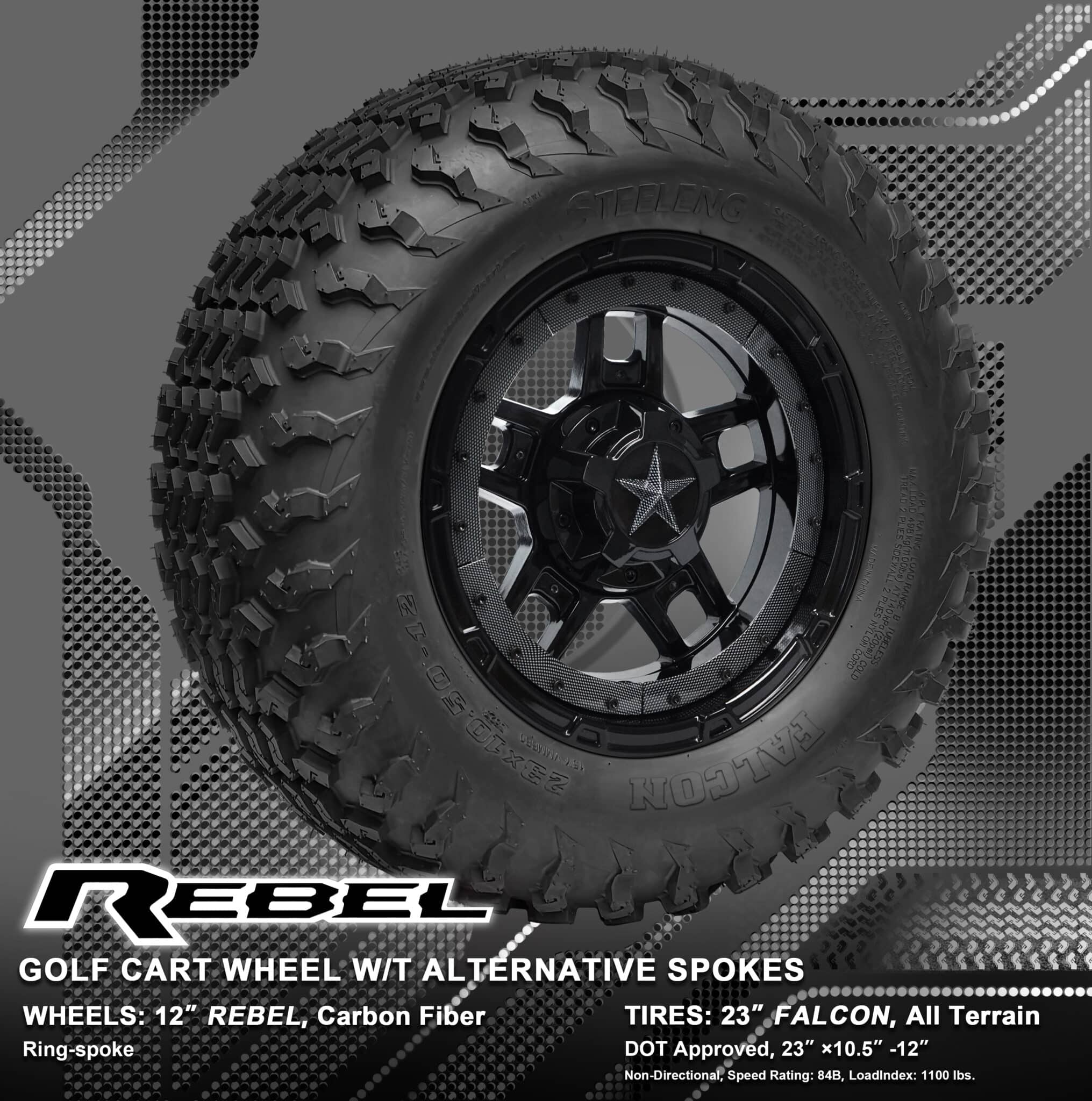 BNDL-TR1214-WH1251-WIRB14-LN0002 – SGC 12″ REBEL Glossy Black Wheel – Aluminum Alloy / STEELENG 23″x10.5″-12″ FALCON All Terrain Tire / REBEL Inserts-Ring-Carbon Fiber