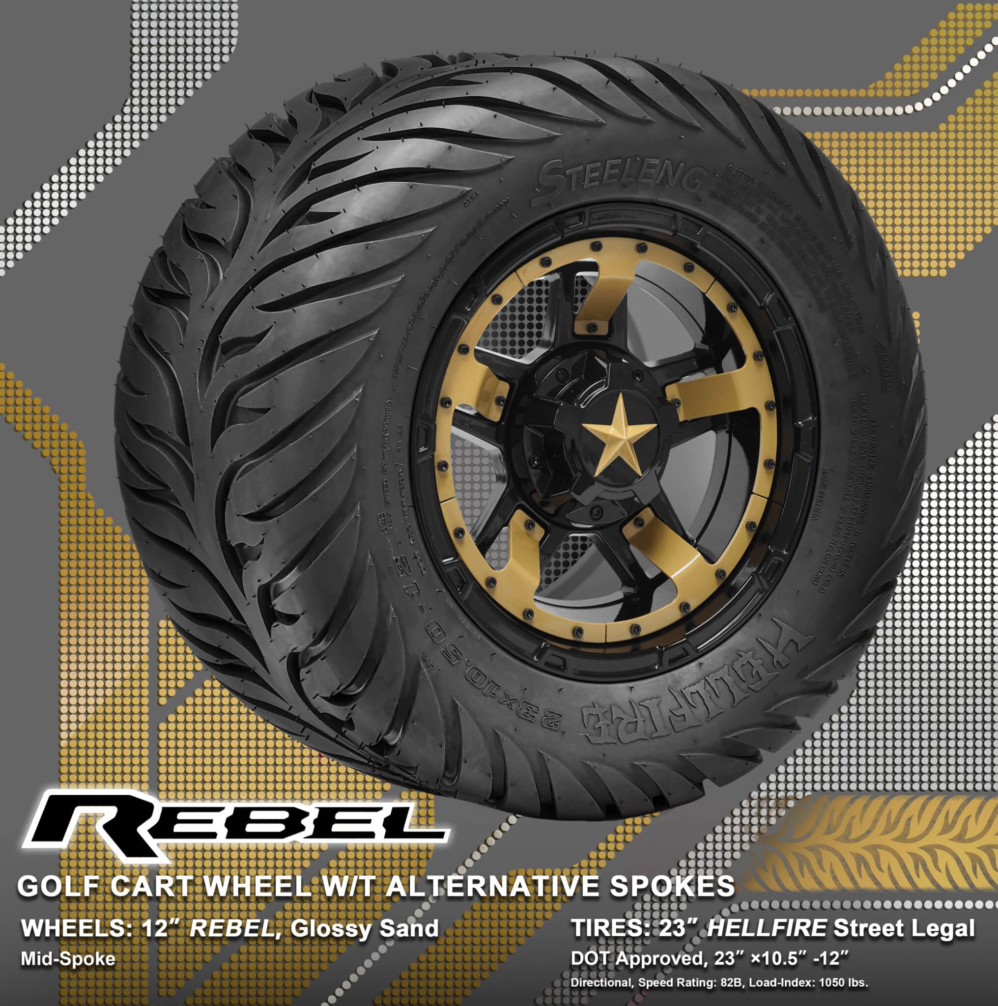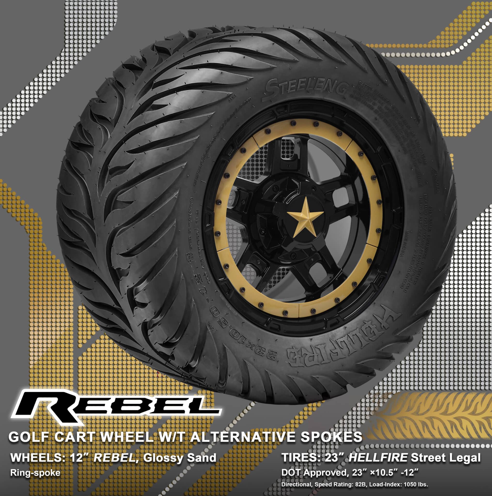 BNDL-TR1215-WH1251-WIRB09-LN0002 – SGC 12″ REBEL Glossy Black Wheel – Aluminum Alloy / STEELENG 23”x10.5”-12” HELLFIRE Street Tire DOT approved / REBEL Inserts-Mid Spoke-Glossy Sand