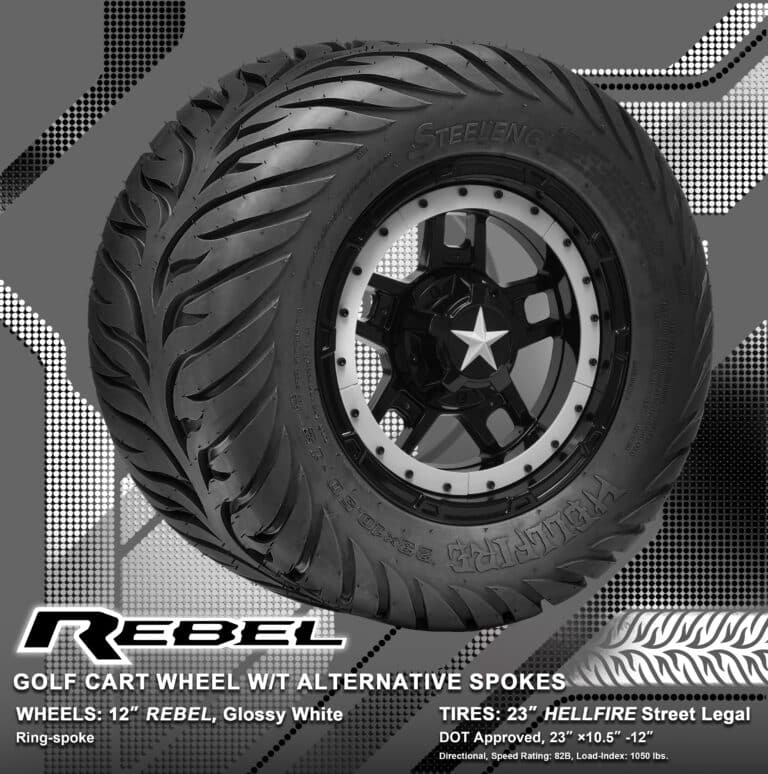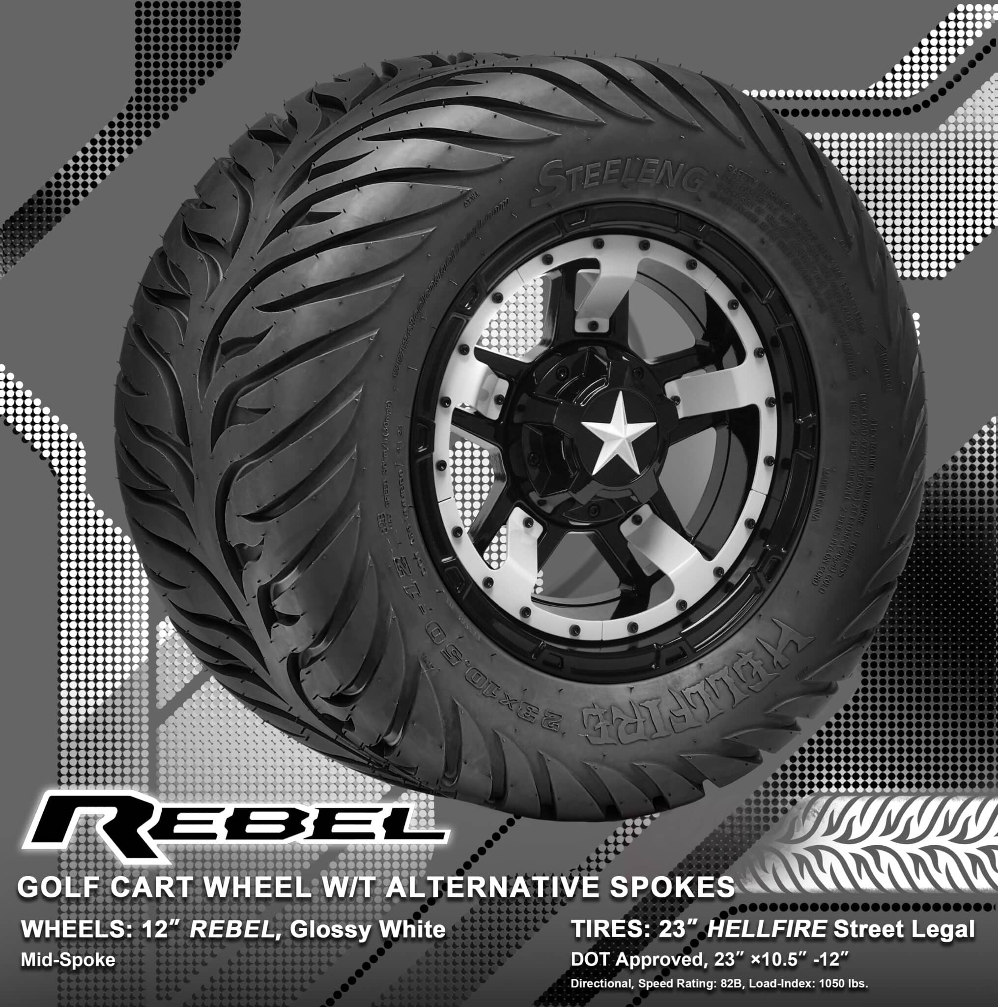 BNDL-TR1215-WH1251-WIRB10-LN0002 – SGC 12″ REBEL Glossy Black Wheel – Aluminum Alloy / STEELENG 23”x10.5”-12” HELLFIRE Street Tire DOT approved / REBEL Inserts-Mid Spoke-Glossy White