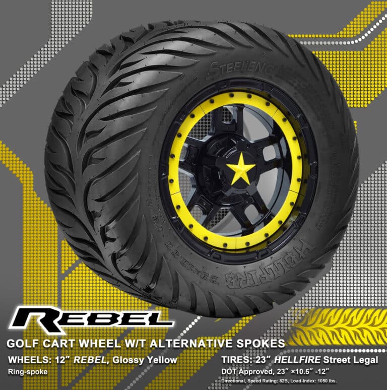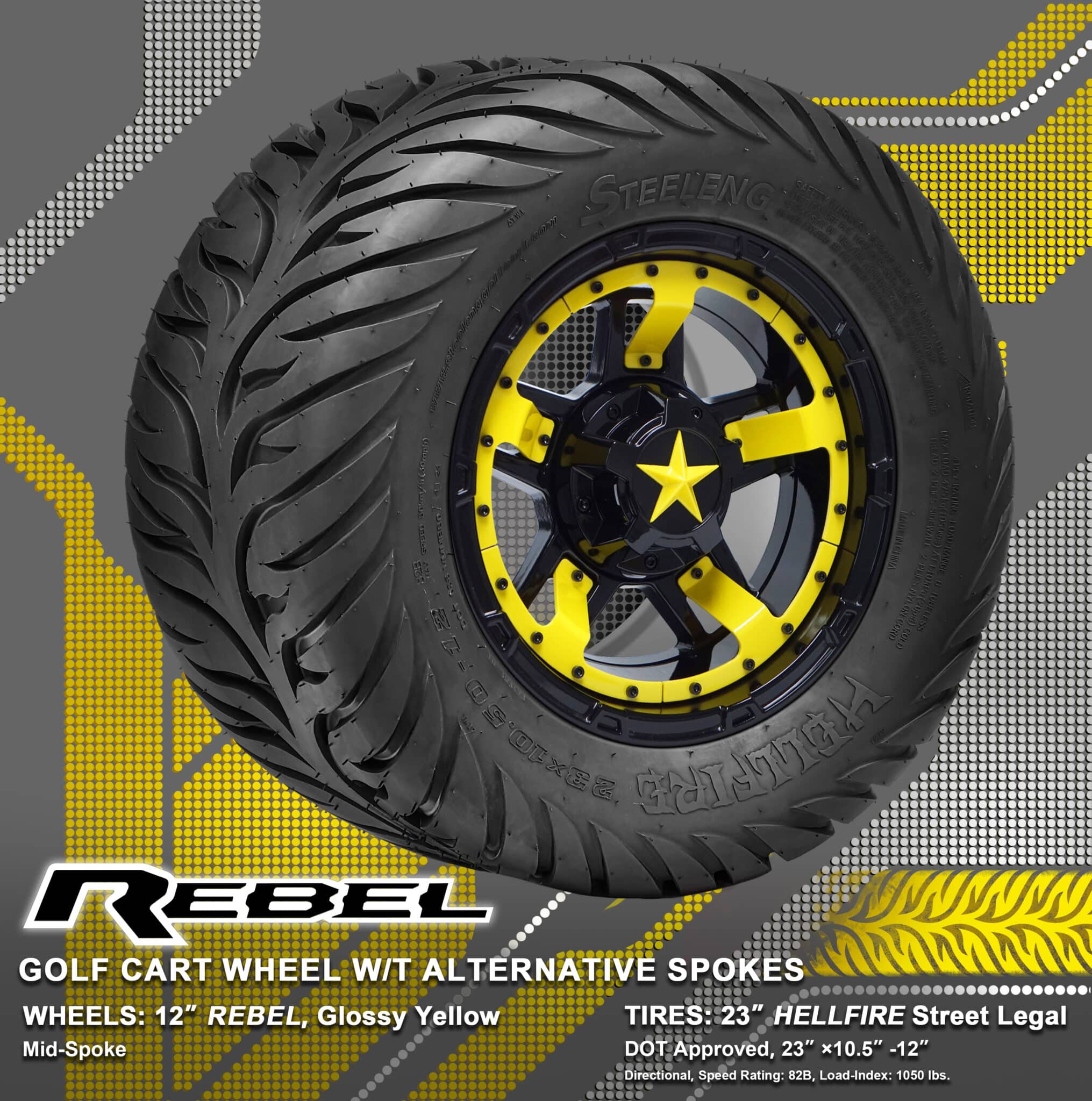 BNDL-TR1215-WH1251-WIRB11-LN0002 – SGC 12″ REBEL Glossy Black Wheel – Aluminum Alloy / STEELENG 23”x10.5”-12” HELLFIRE Street Tire DOT approved / REBEL Inserts-Mid Spoke-Glossy Yellow
