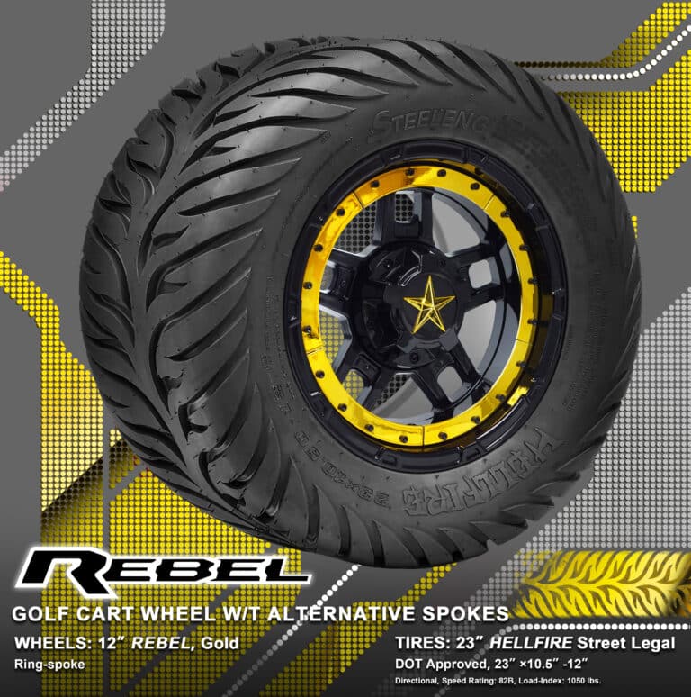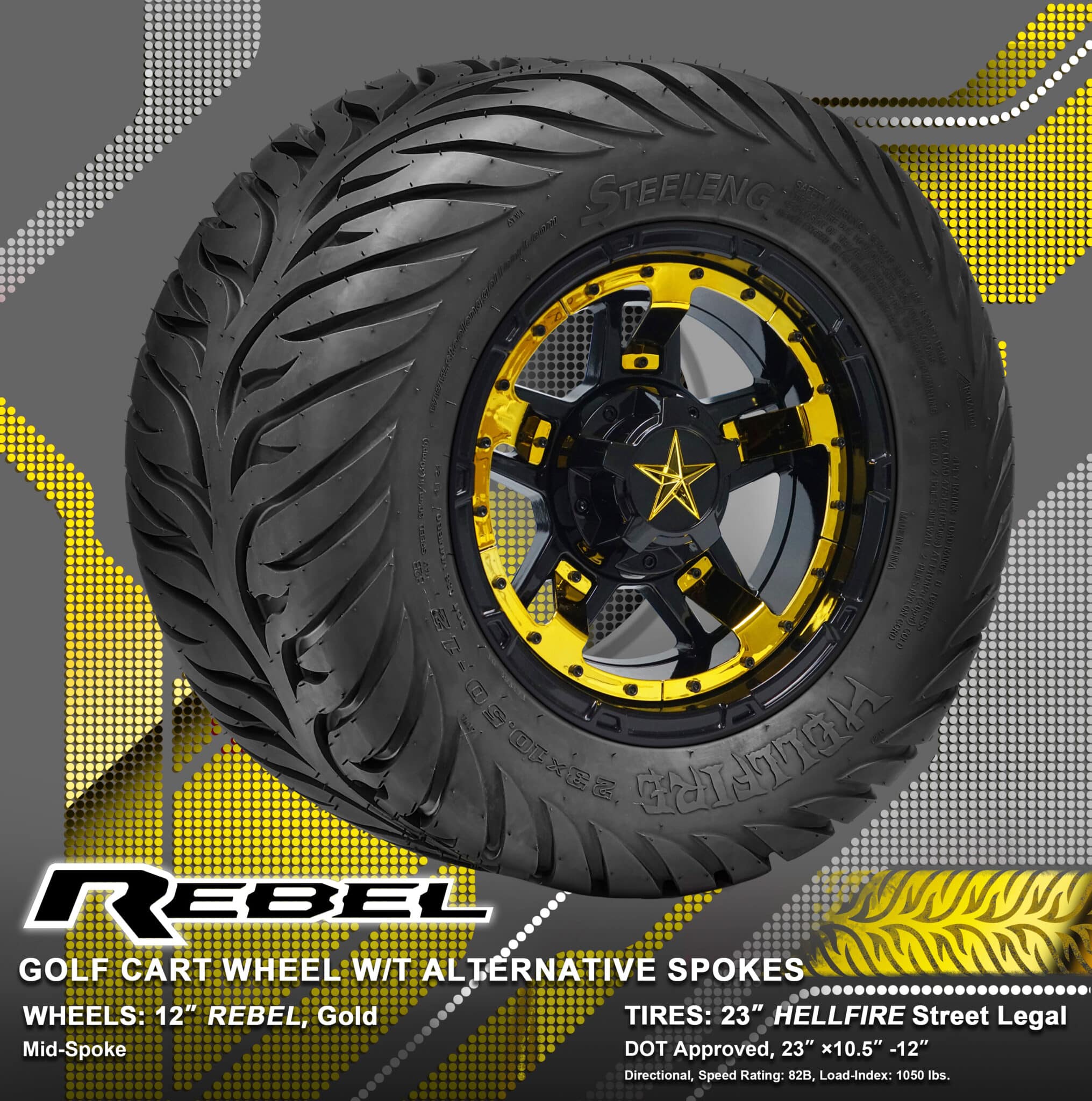 BNDL-TR1215-WH1251-WIRB12-LN0002 – SGC 12″ REBEL Glossy Black Wheel – Aluminum Alloy / STEELENG 23”x10.5”-12” HELLFIRE Street Tire DOT approved / REBEL Inserts-Mid Spoke-Gold