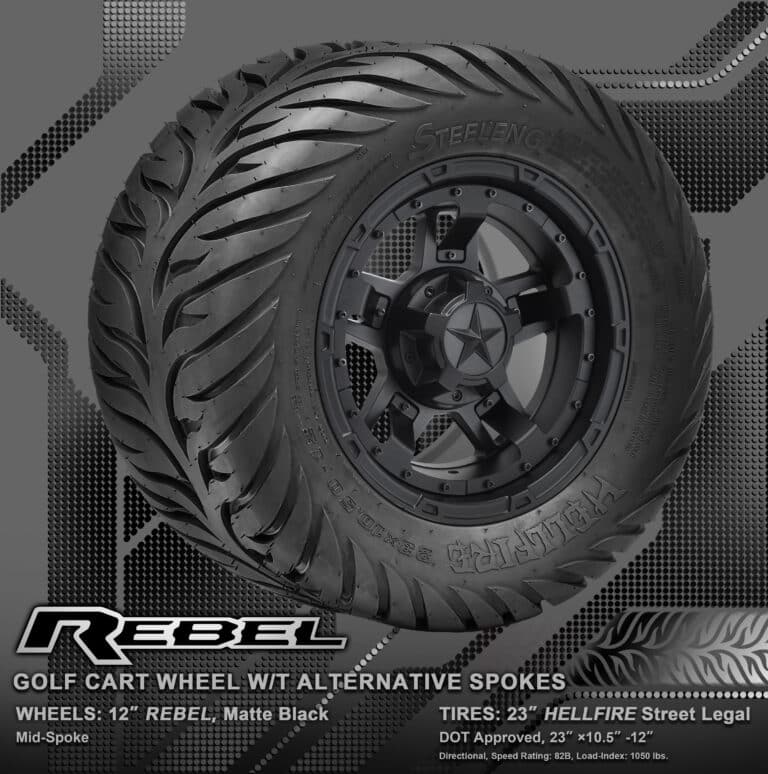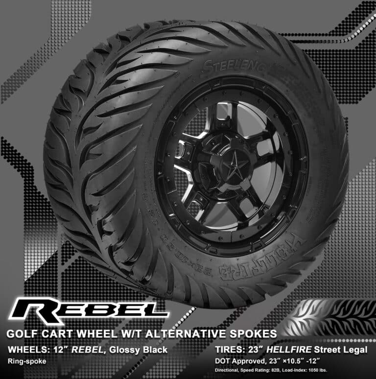 BNDL-TR1215-WH1251-WIRB13-LN0002 – SGC 12″ REBEL Glossy Black Wheel – Aluminum Alloy / STEELENG 23”x10.5”-12” HELLFIRE Street Tire DOT approved / REBEL Inserts-Mid Spoke-Matte Black