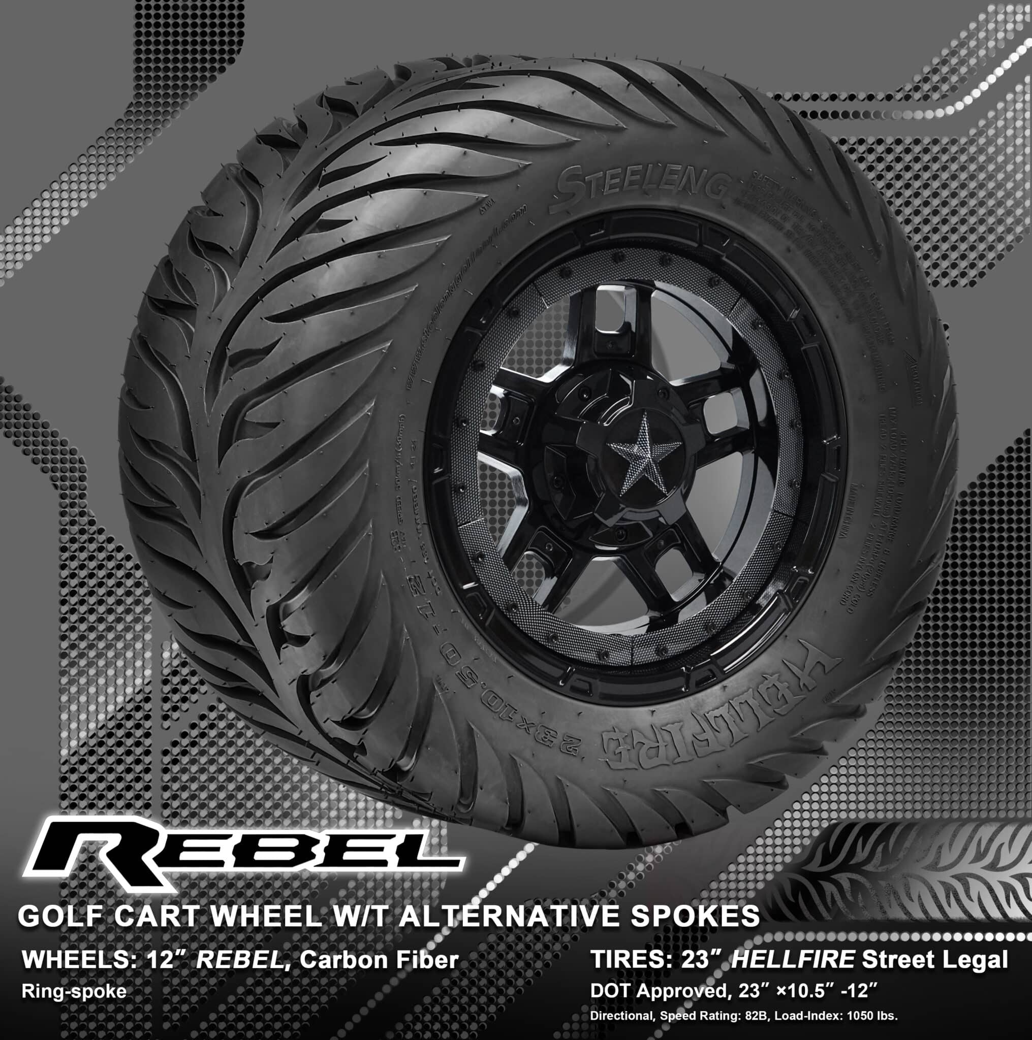 BNDL-TR1215-WH1251-WIRB14-LN0002 – SGC 12″ REBEL Glossy Black Wheel – Aluminum Alloy / STEELENG 23”x10.5”-12” HELLFIRE Street Tire DOT approved / REBEL Inserts-Ring-Carbon Fiber