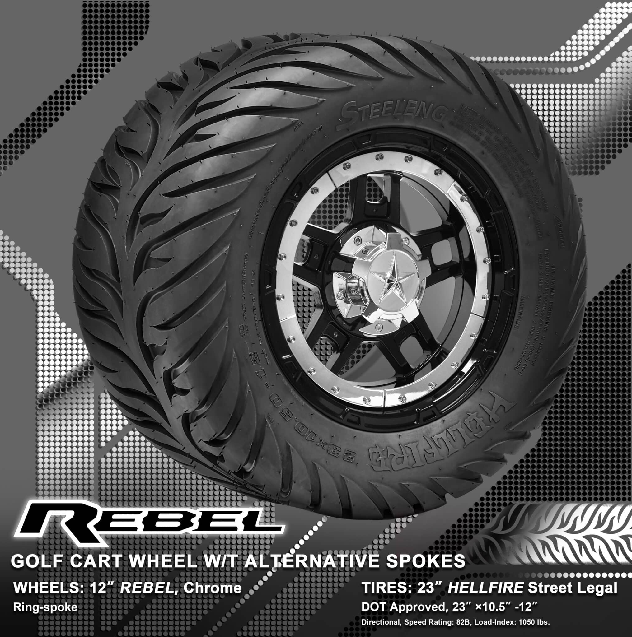 BNDL-TR1215-WH1251-WIRB15-LN0002 – SGC 12″ REBEL Glossy Black Wheel – Aluminum Alloy / STEELENG 23”x10.5”-12” HELLFIRE Street Tire DOT approved / REBEL Inserts-Ring-Chrome