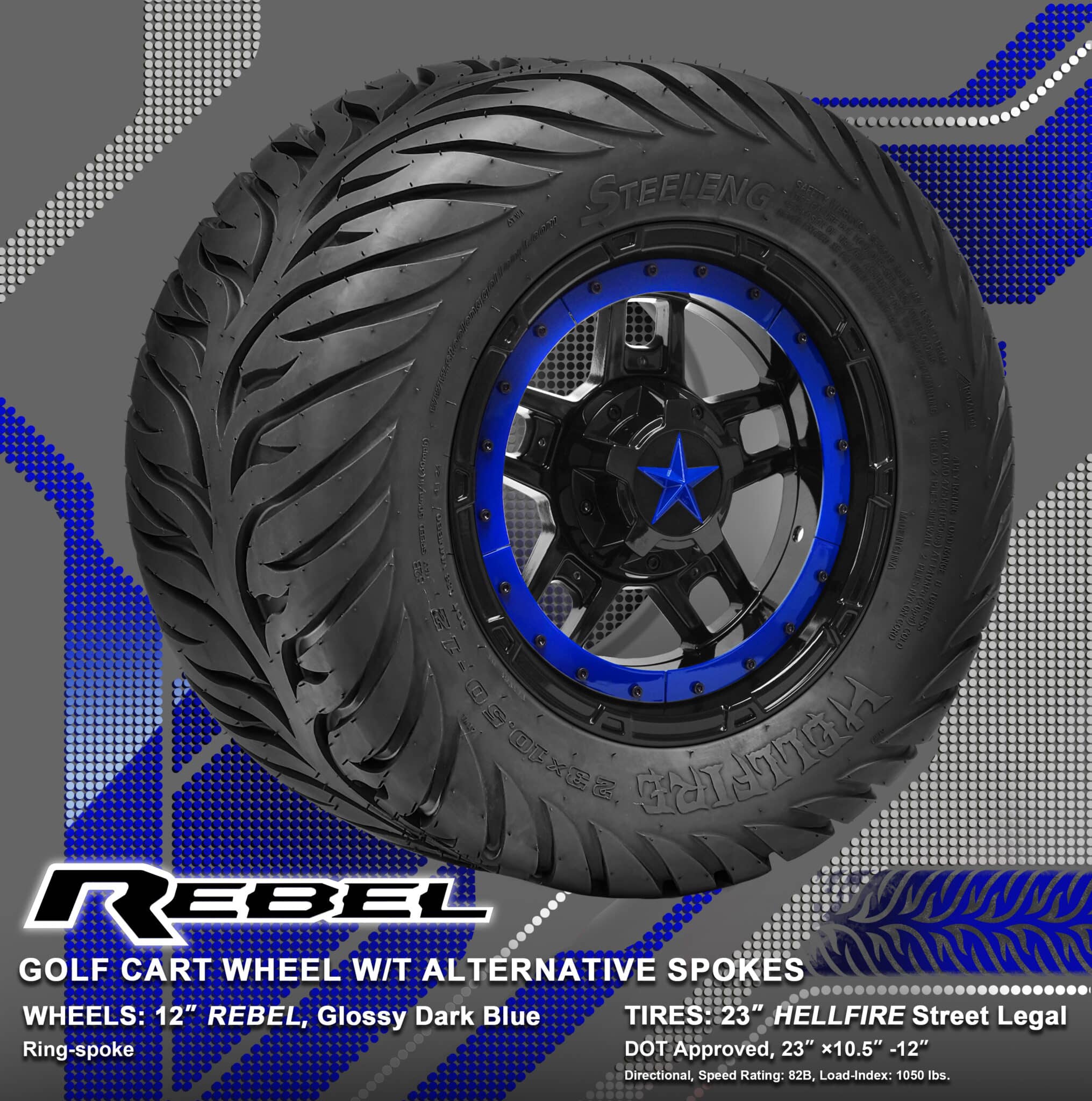 BNDL-TR1215-WH1251-WIRB17-LN0002 – SGC 12″ REBEL Glossy Black Wheel – Aluminum Alloy / STEELENG 23”x10.5”-12” HELLFIRE Street Tire DOT approved / REBEL Inserts-Ring-Glossy Dark Blue