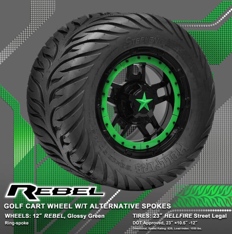 BNDL-TR1215-WH1251-WIRB19-LN0002 – SGC 12″ REBEL Glossy Black Wheel – Aluminum Alloy / STEELENG 23”x10.5”-12” HELLFIRE Street Tire DOT approved / REBEL Inserts-Ring-Glossy Green