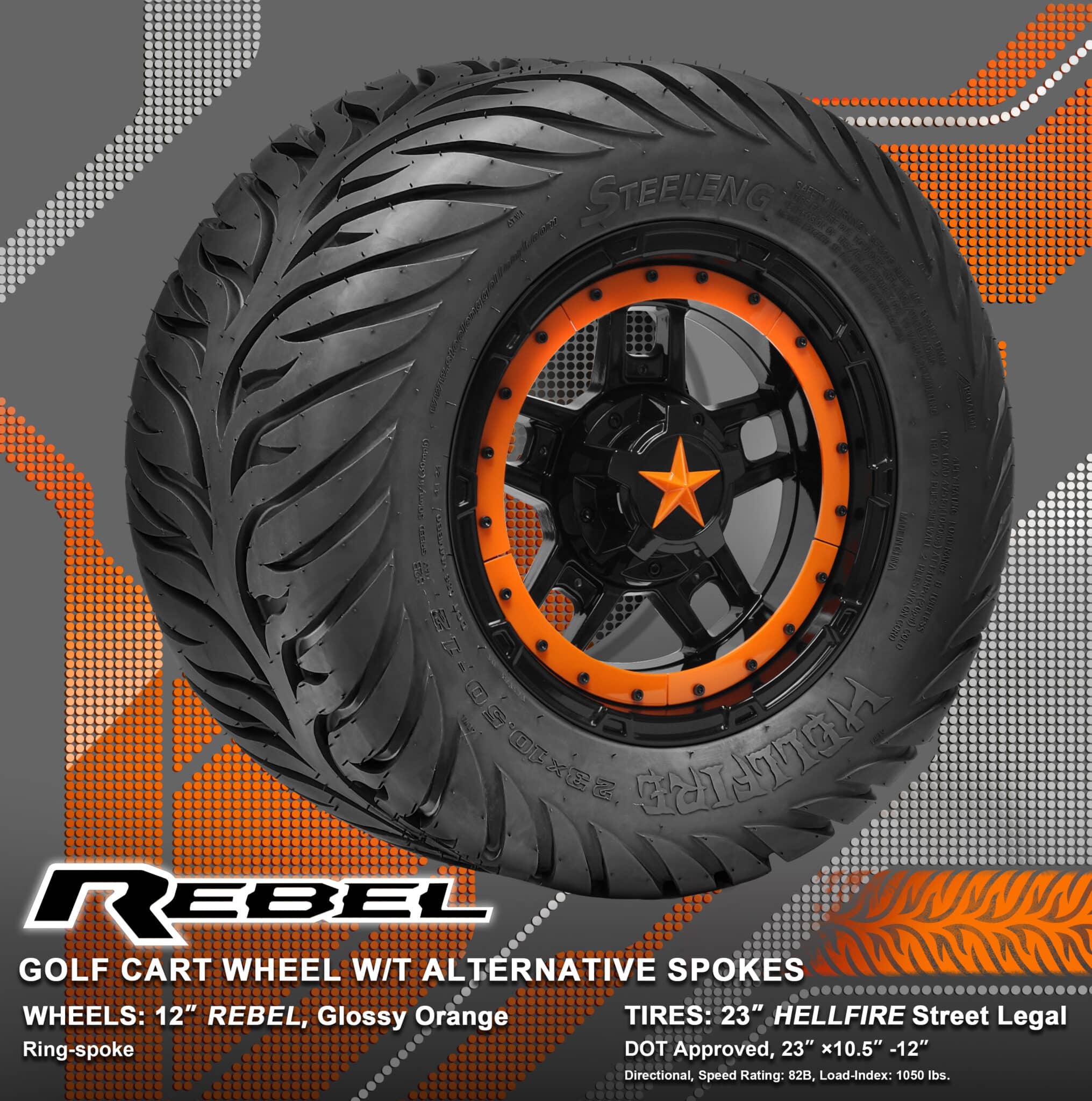 BNDL-TR1215-WH1251-WIRB20-LN0002 – SGC 12″ REBEL Glossy Black Wheel – Aluminum Alloy / STEELENG 23”x10.5”-12” HELLFIRE Street Tire DOT approved / REBEL Inserts-Ring-Glossy Orange