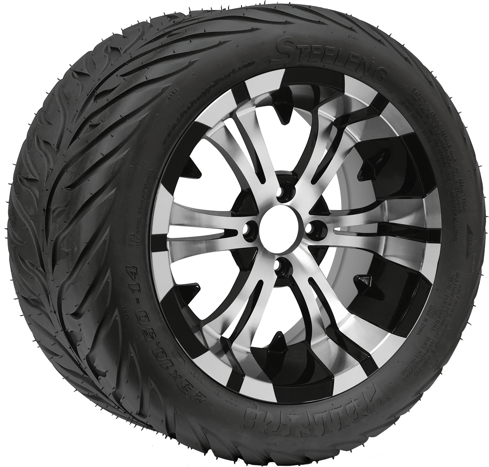 BNDL-TR1406-WH1413-CC0001-LN – SGC 14″ Vampire Machined/Black Wheel – Aluminum Alloy / STEELENG 23″x10.5″-14″ HELLFIRE Street Tire DOT approved