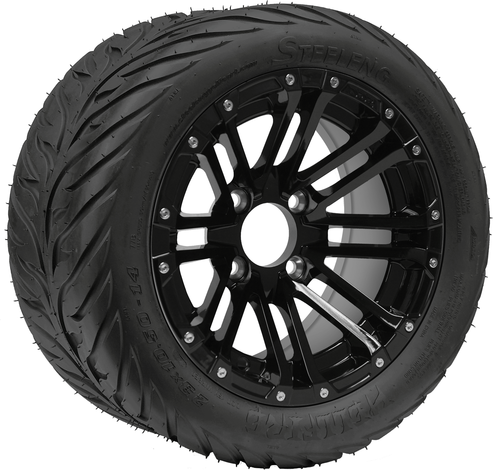 BNDL-TR1406-WH1425-CC0002-LN – SGC 14″ Lancer Glossy Black Wheel – Aluminum Alloy / STEELENG 23″x10.5″-14″ HELLFIRE Street Tire DOT approved